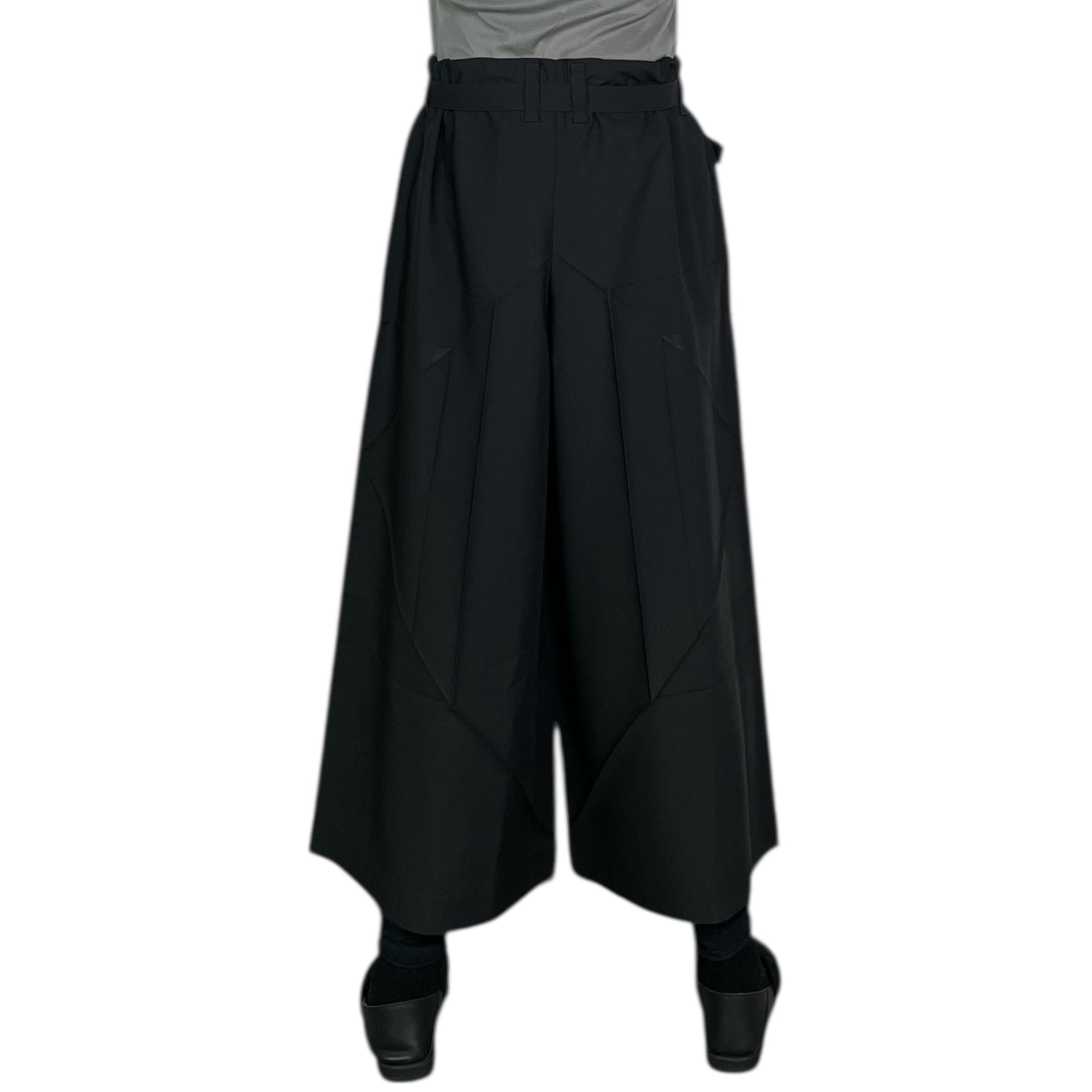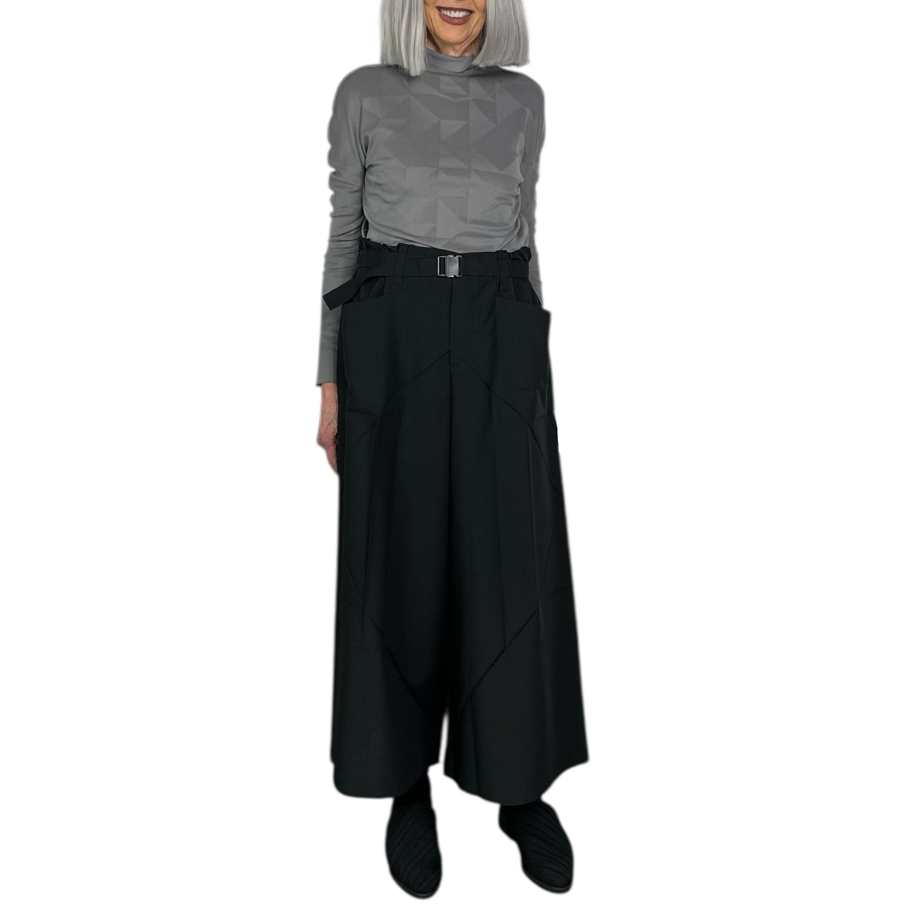 Pleated wide leg pant with elasticized waistband and included belt. Two front pockets.