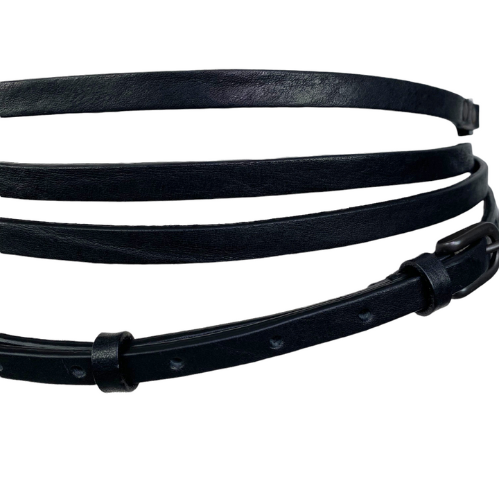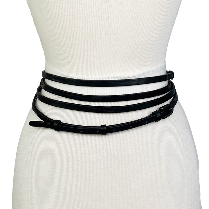 Narrow 3/8” wide belt, extra long to triple wrap. Metal buckle