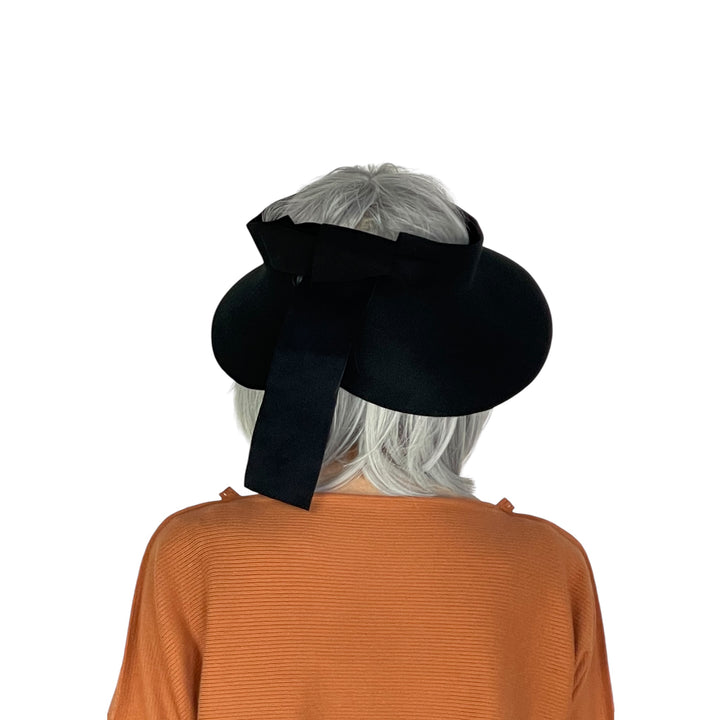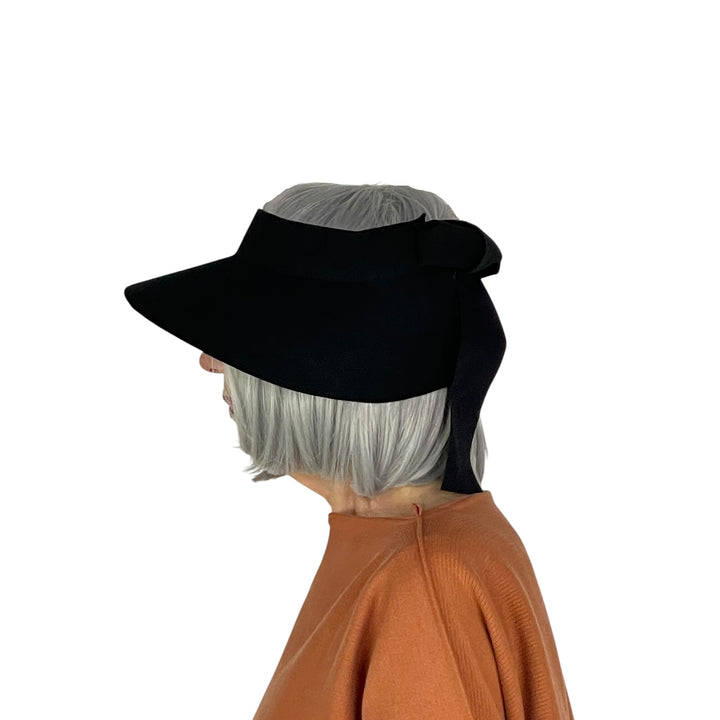 Packable visor hat with ribbon tie at circumference and snap closure at brim.