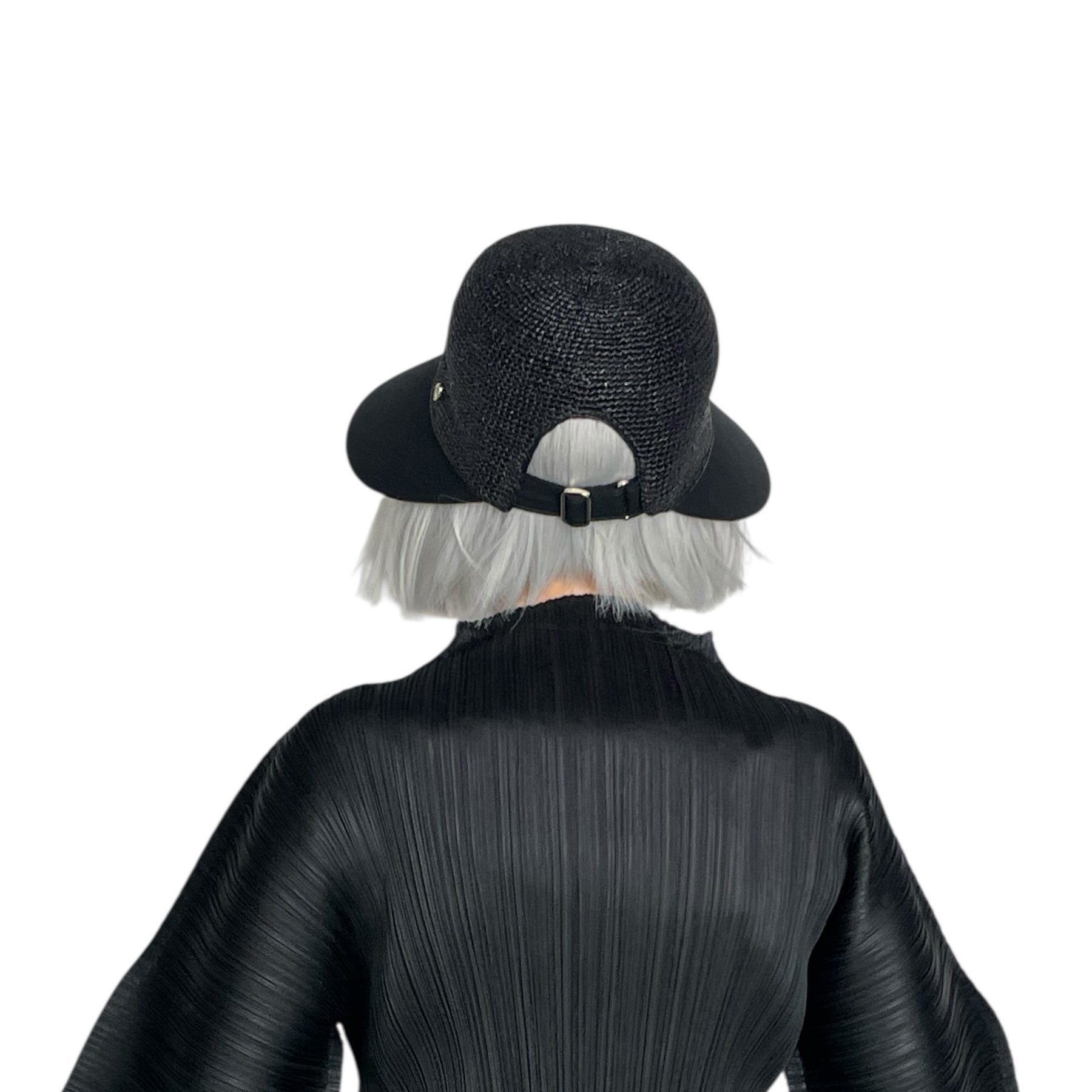 Crocheted raffia hat with a 4.75" cotton canvas brim.  Elastic inner band and adjustable band at back.