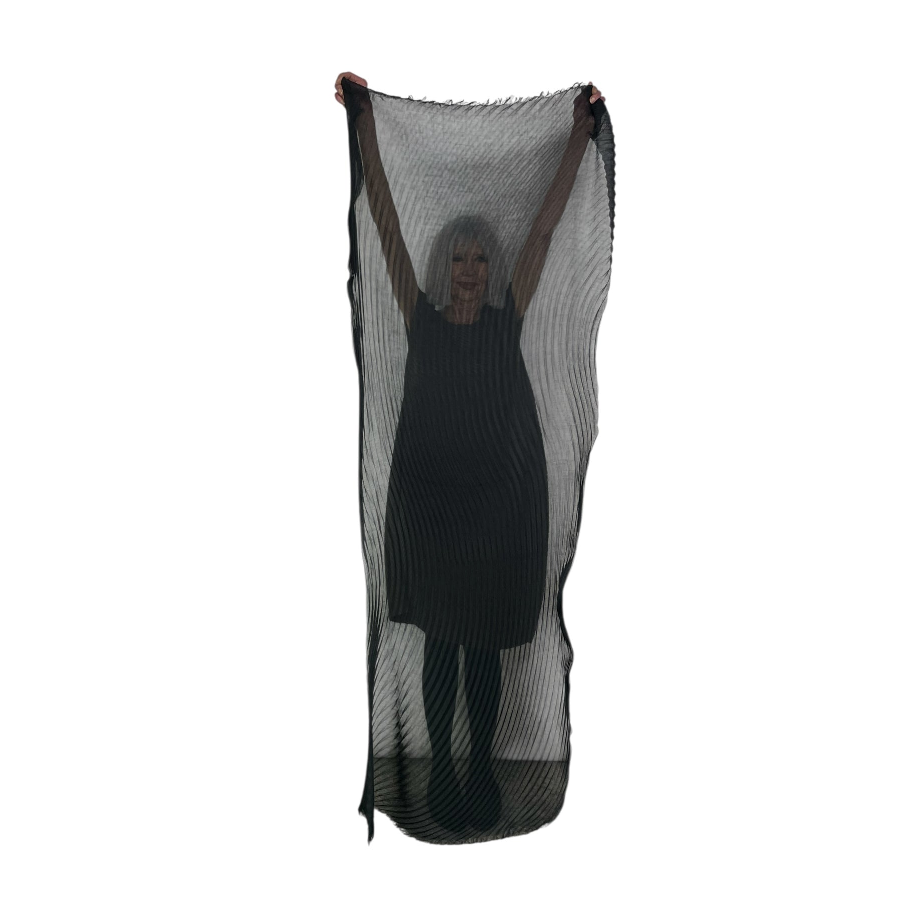 Large hand-pleated stole with fringed ends. Feather-light weight fabric with a soft fluffy finish.