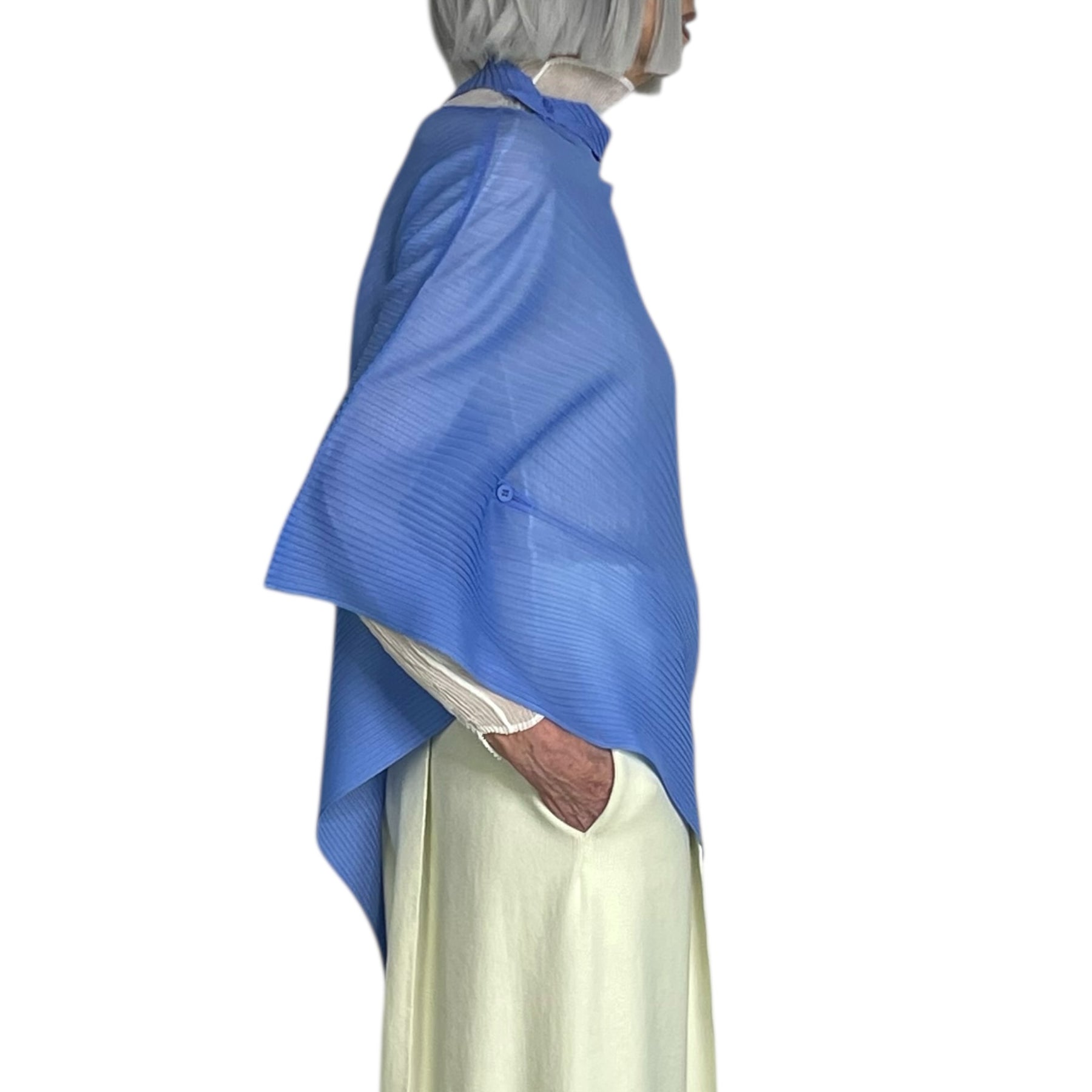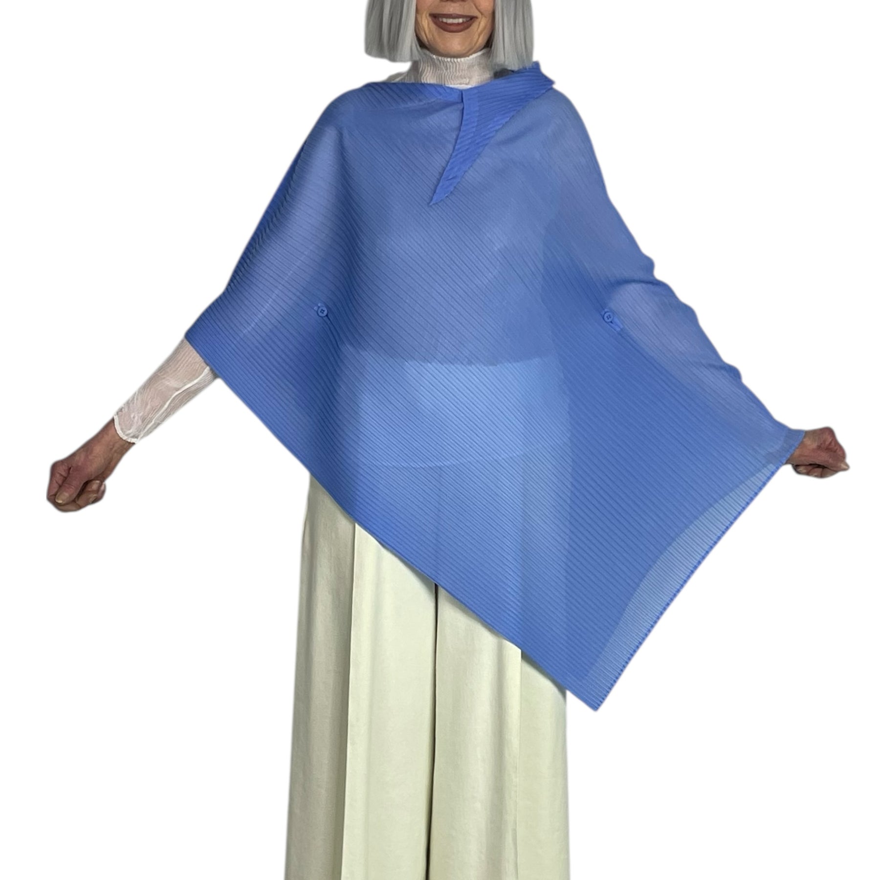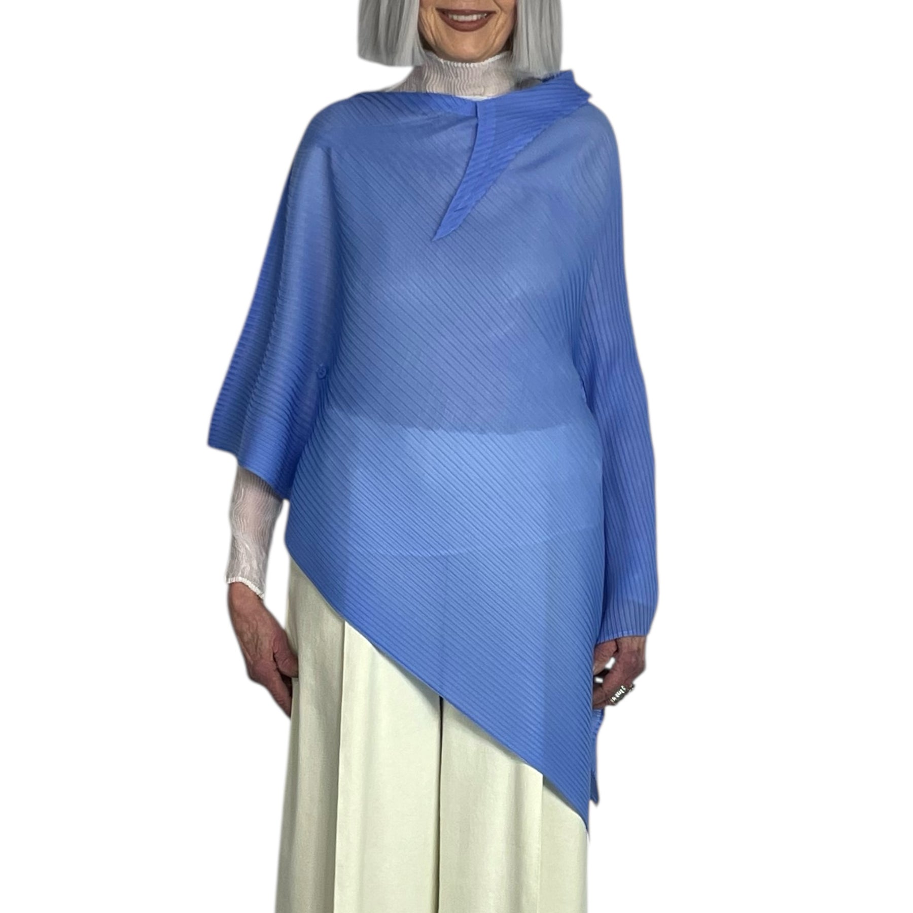 Pleated semi-sheer poncho-style scarf/top with an asymmetric hemline. Button at neck and buttons at sides to create "sleeves".