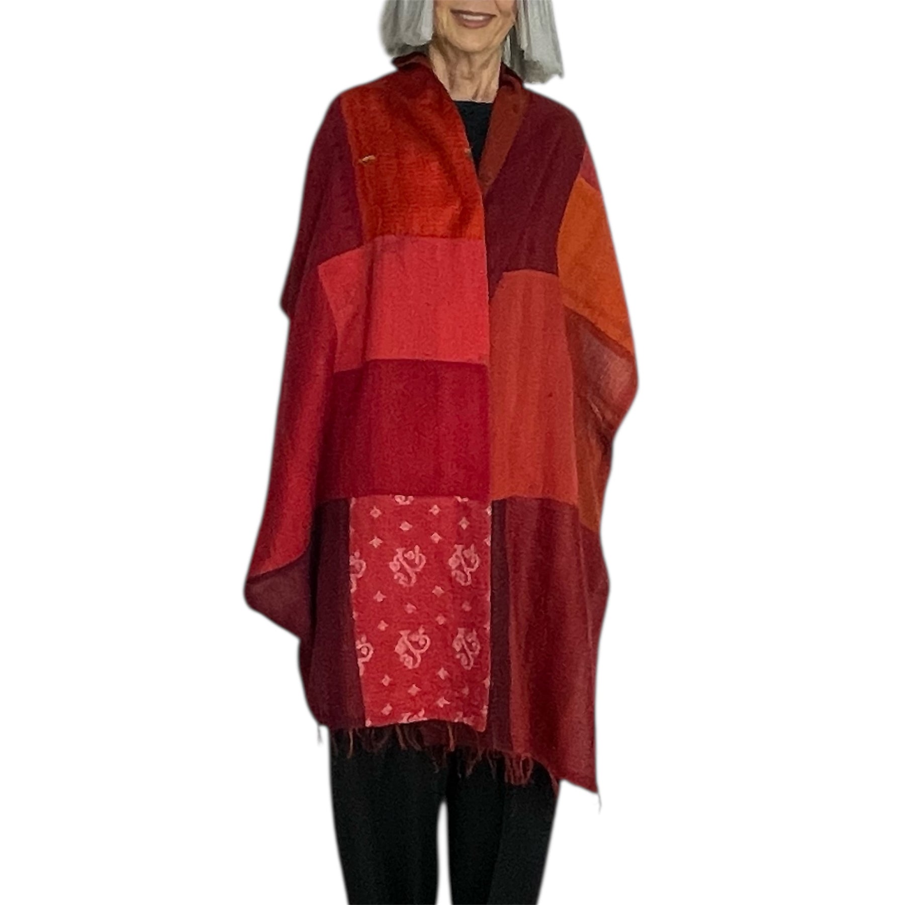 Reversible patch and ombre scarf with fringed ends. Front is cotton and silk patch, reverse is vintage cotton.