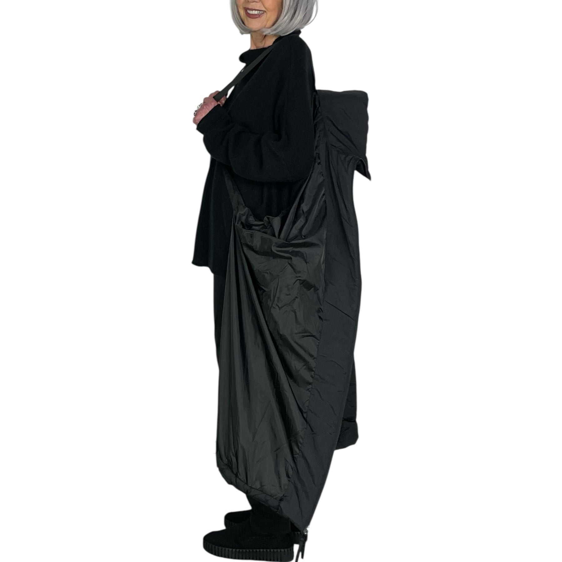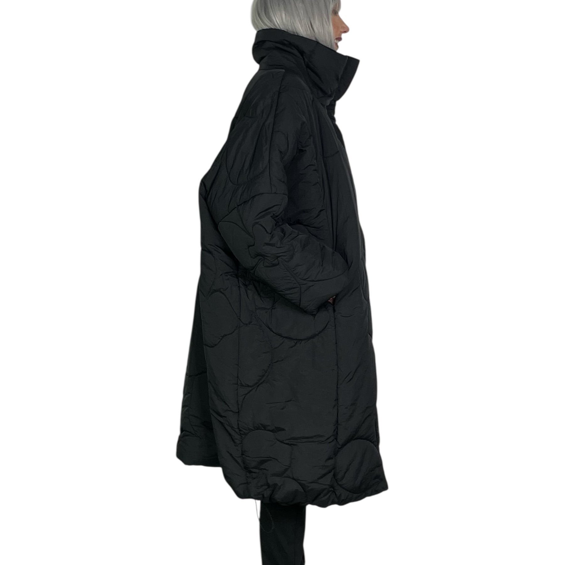 Quilted puffer car coat with 2-way zip front closure and high neckline. Two side zippered pockets, elasticized cuffs, drawcord adjustment at hem. Wide silhouette, generous fit.  Interior shoulder straps for hands-free carrying.