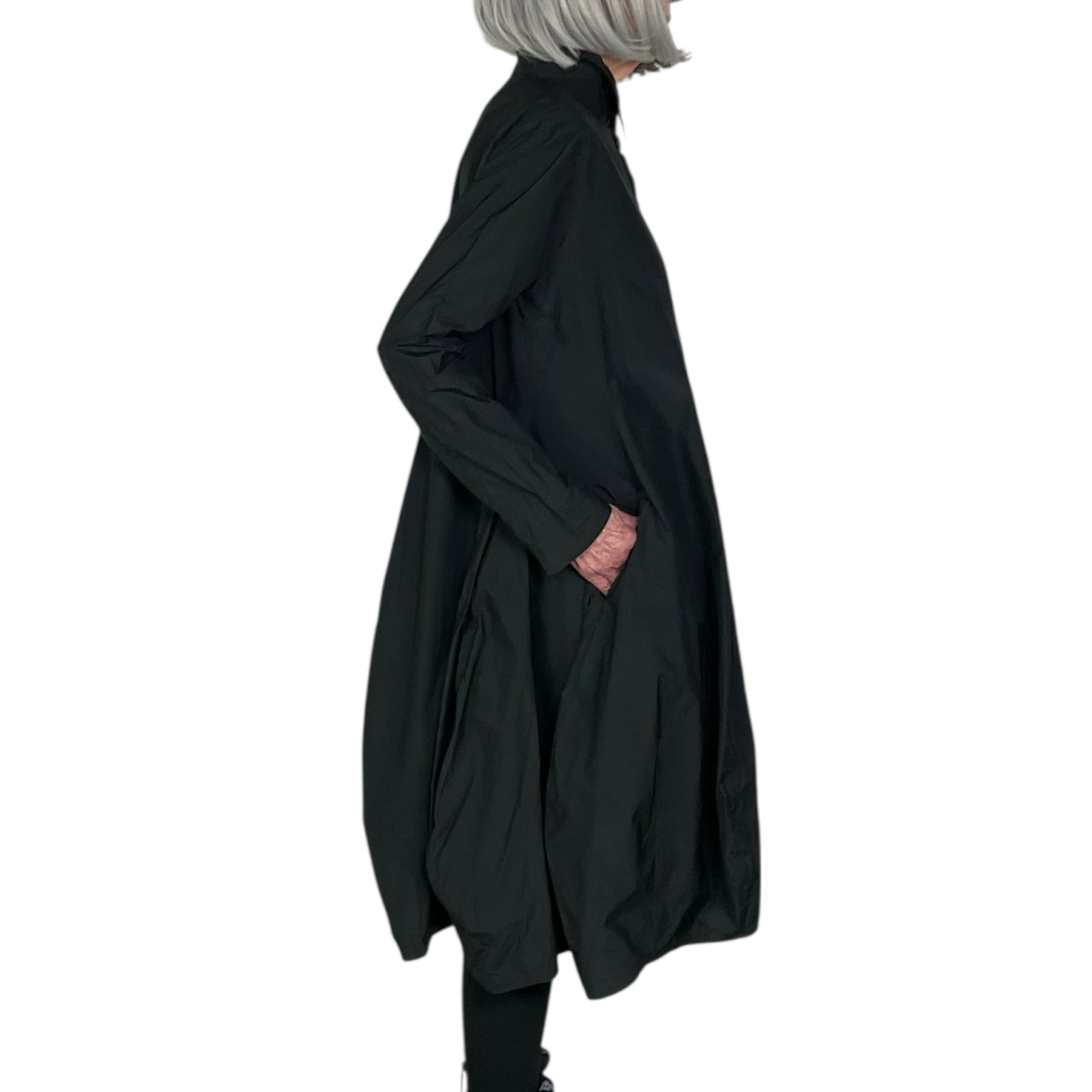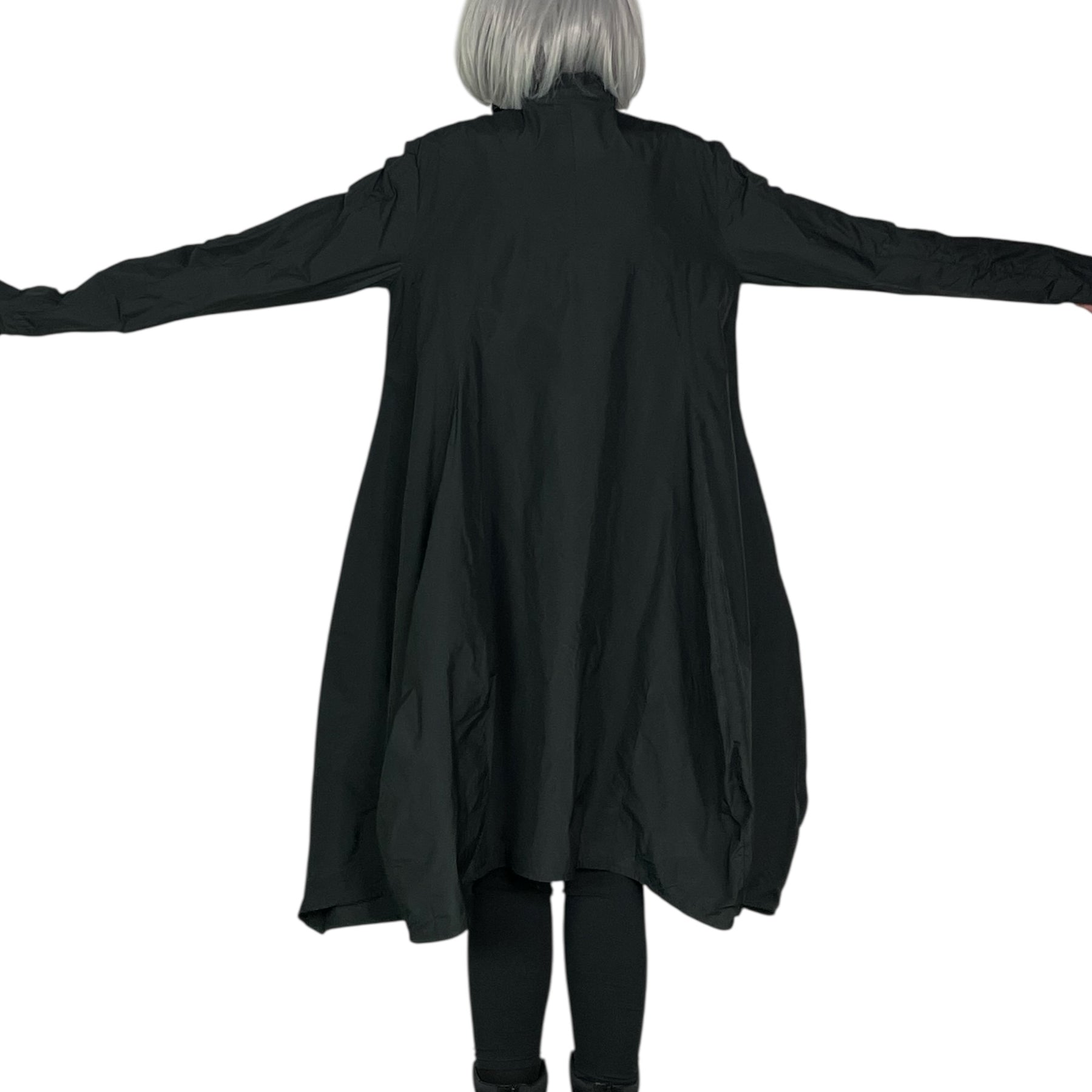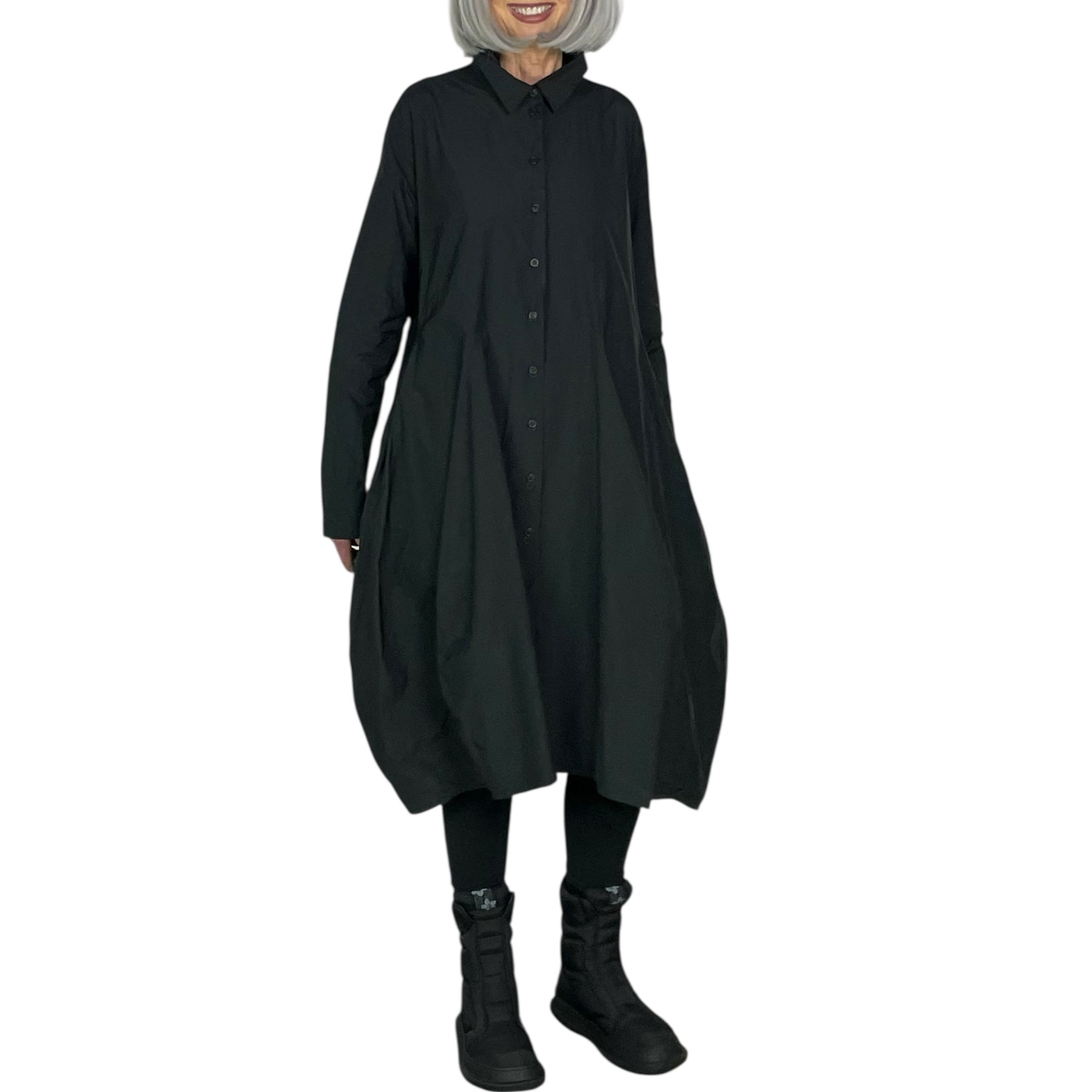 Long sleeve collared dress with a full button front closure and two side slit pockets. Curved seams at skirt create a petal-like silhouette. Wide, generous fit. Lightweight smooth taffeta fabric. Can also be worn open as a duster.
