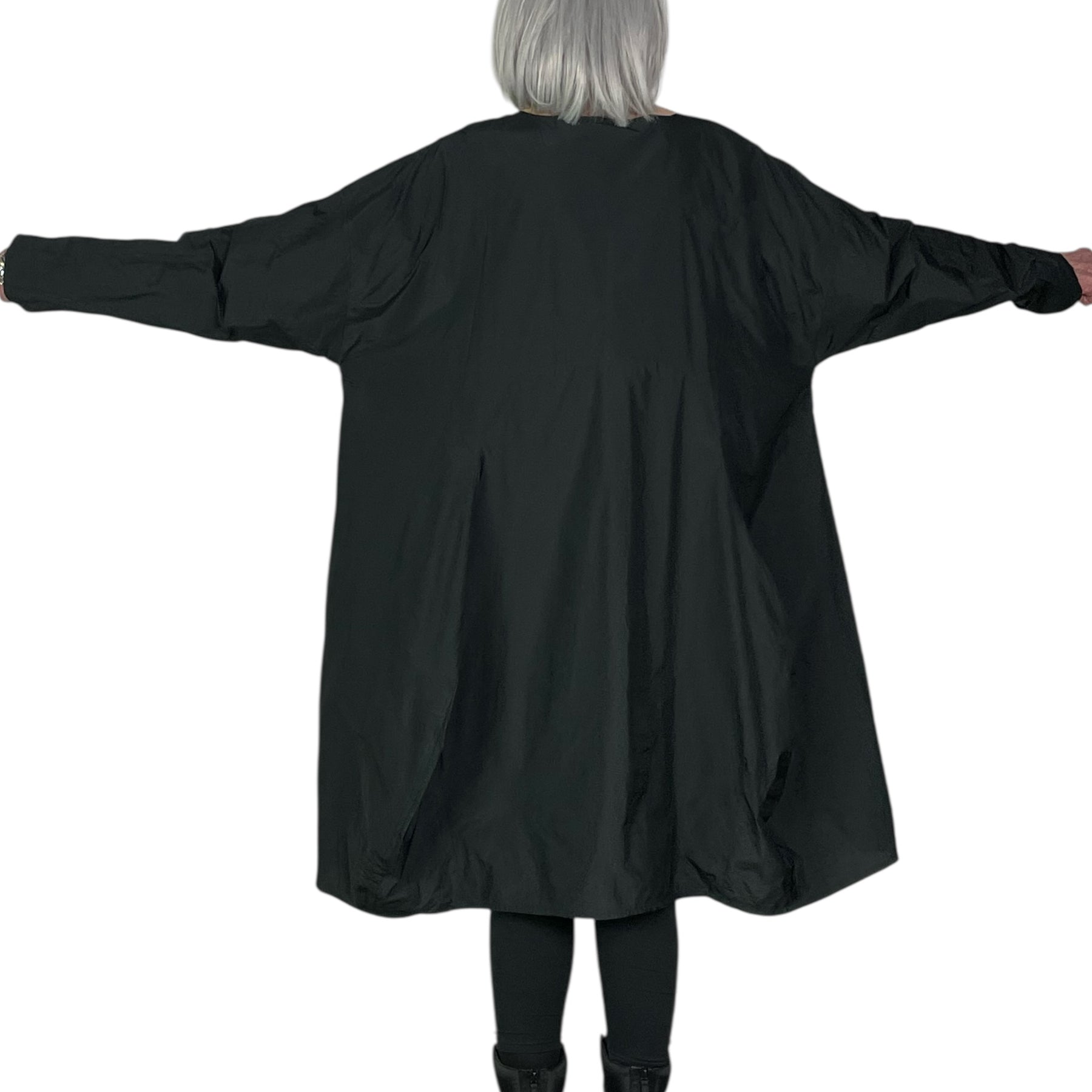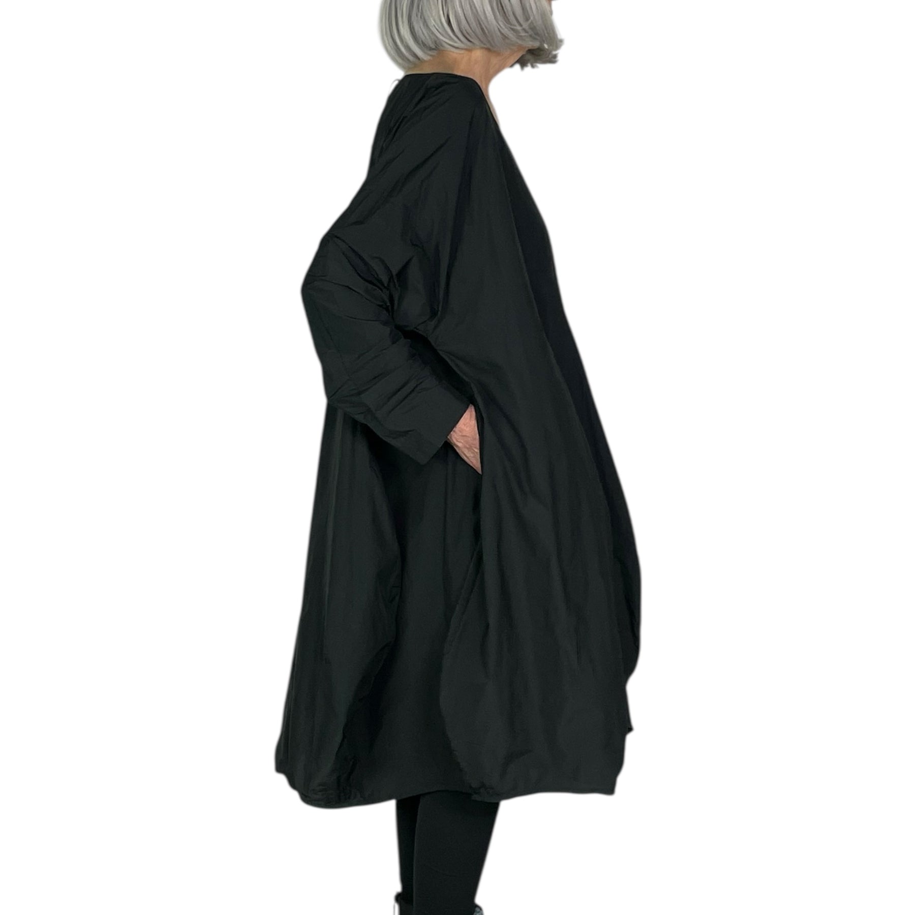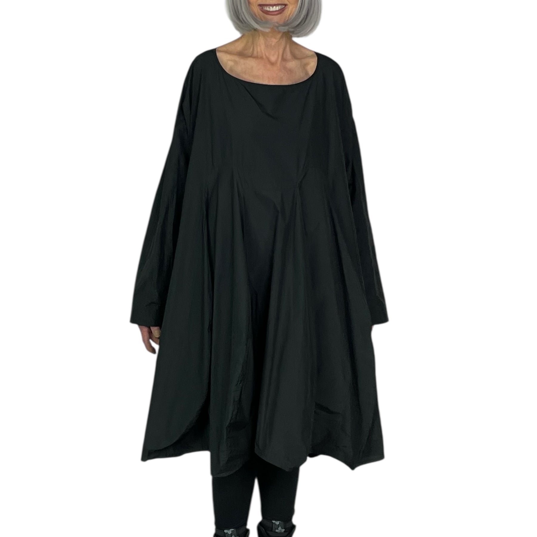 Long sleeve round neck dress with a wide, generous fit. Curved seams at skirt create a petal-like silhouette. Lightweight smooth taffeta fabric.