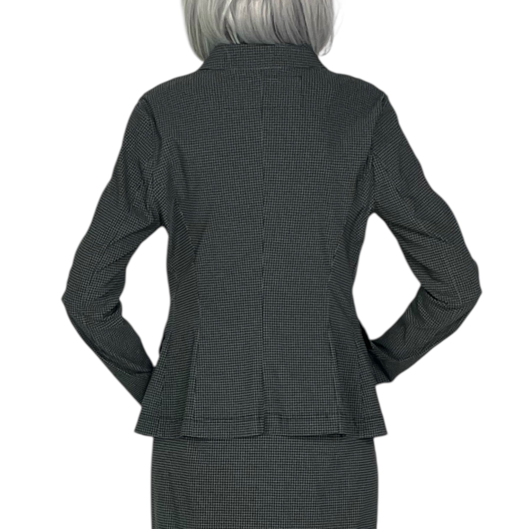 Check print shaped jacket with a notch collar and button front closure. Two front flap pockets, small slit at cuffs.