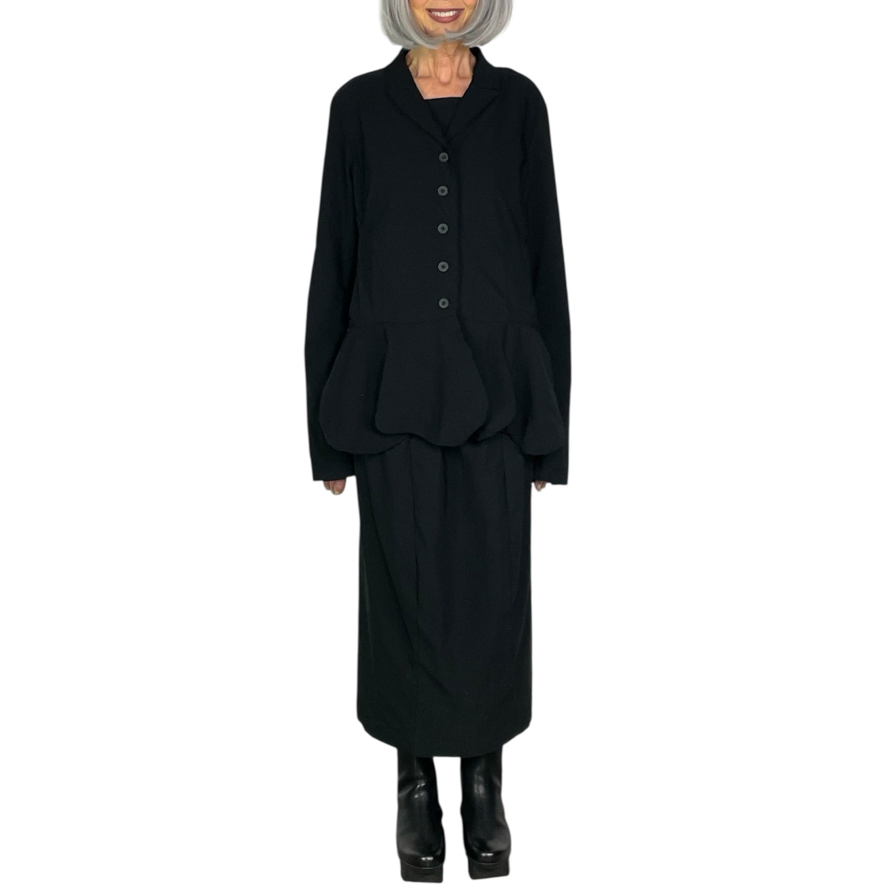Long sleeve shaped jacket with a notch collar and button front closure. Two side pockets, petal peplum, and slit at cuffs.