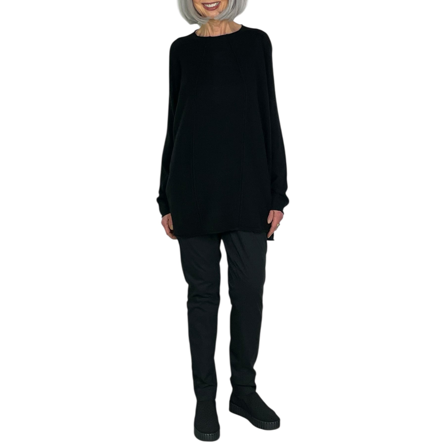 Long sleeve knit pullover sweater with seaming detail. Raglan sleeves, rolled edges throughout. Single ribbed panel on front right side. Generous fit.