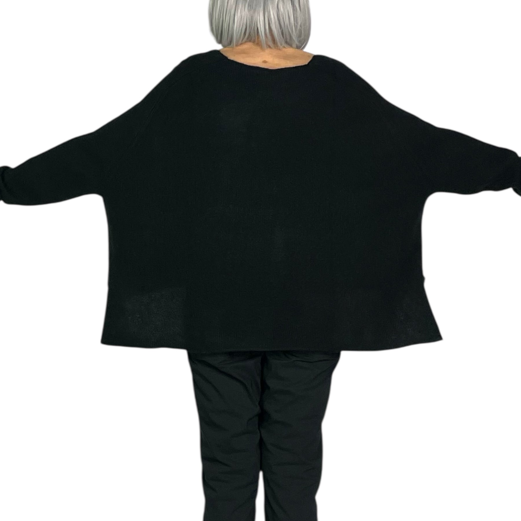 Cropped A-line knit pullover sweater with a crew neckline and hi-lo hem. Raglan sleeves, side slits, rolled edges throughout. Generous fit.