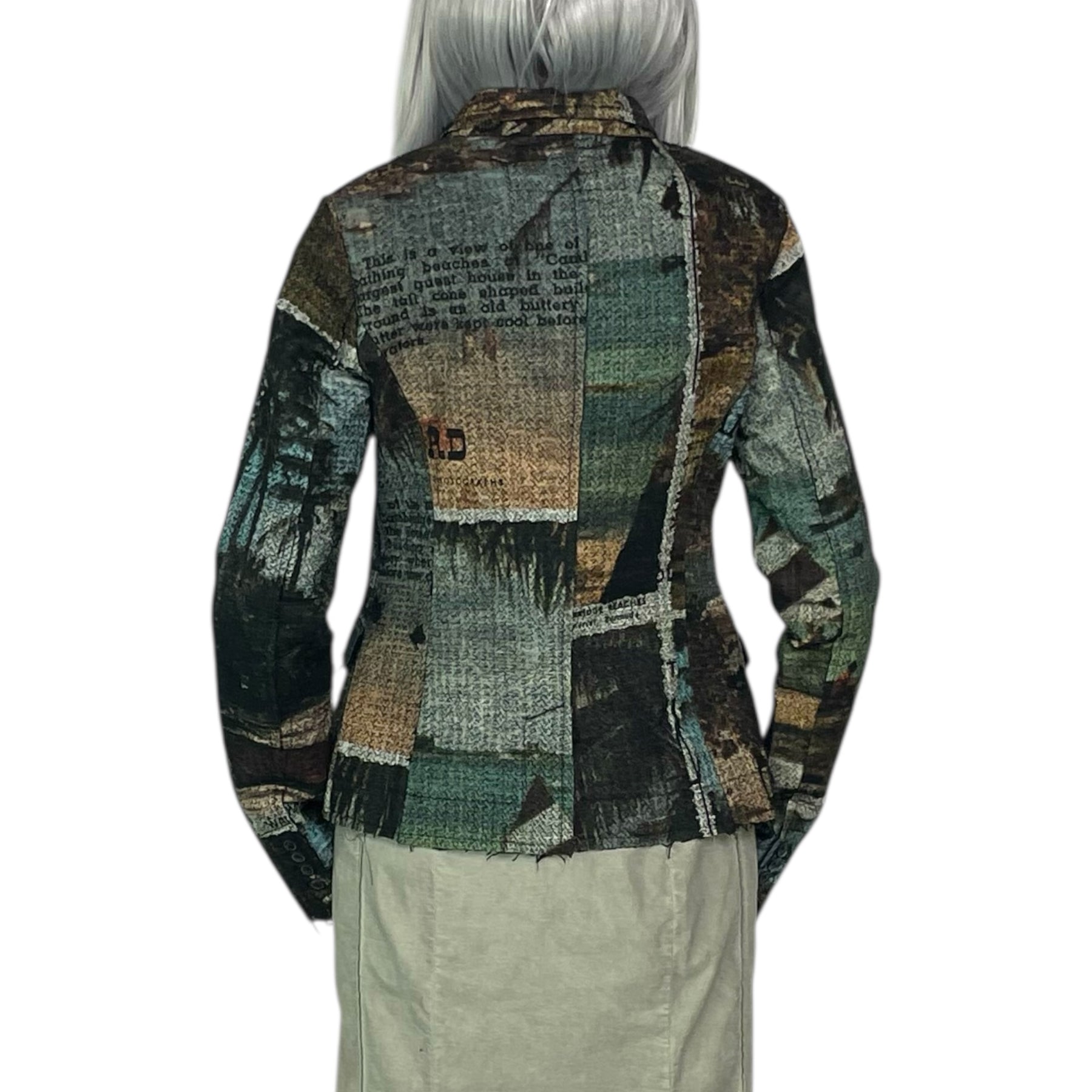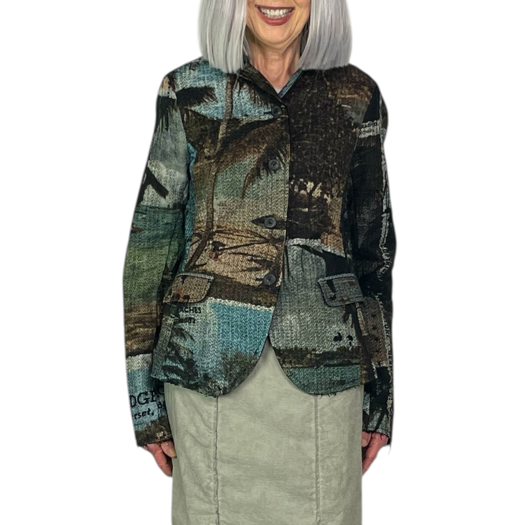 Shaped blazer jacket with button front closure and two front flap pockets. Center back vent, raw edges throughout.