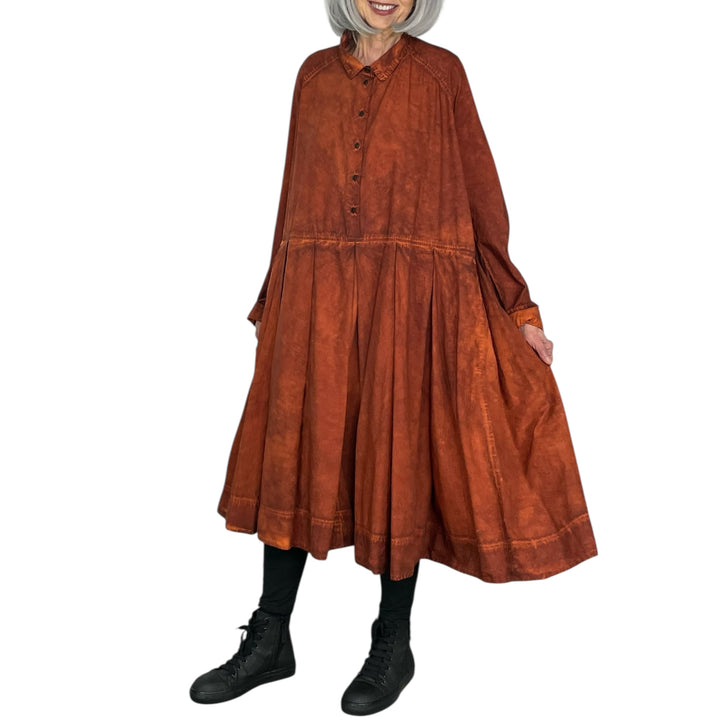 Over-dyed long sleeve dress with a small collar and half button front closure. Raglan sleeves with button at cuffs. Two side pockets at box pleated skirt. Oversized fit.