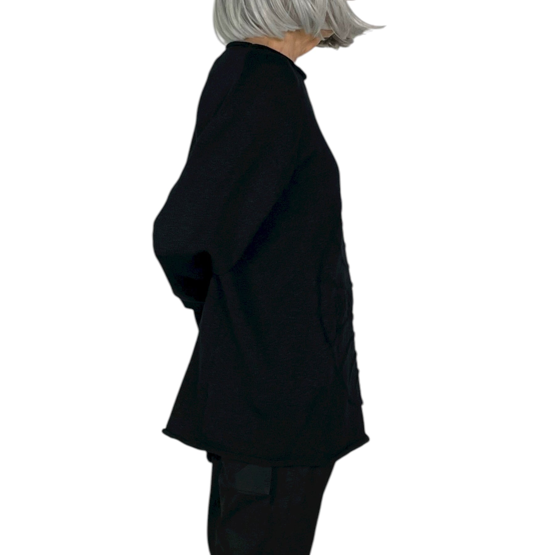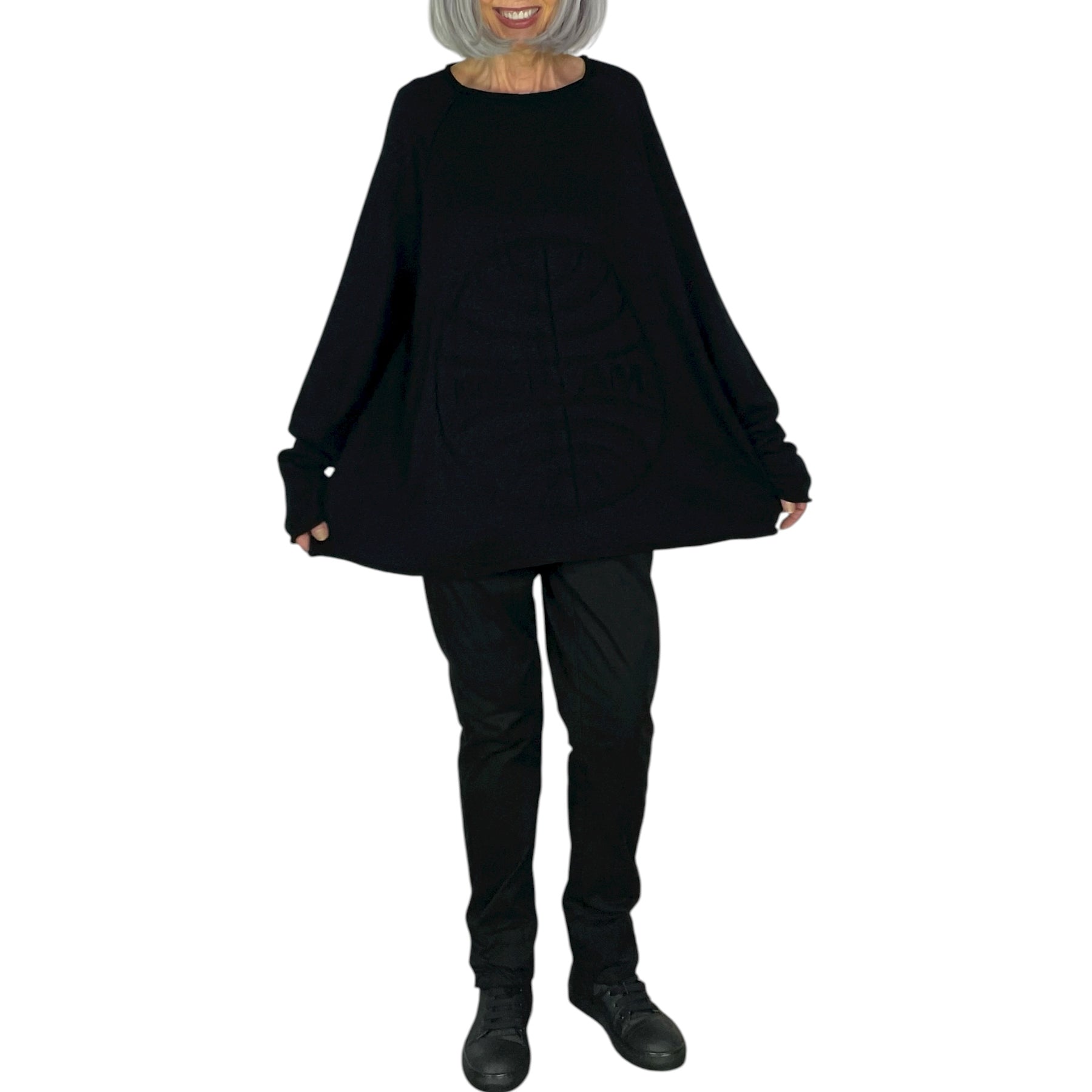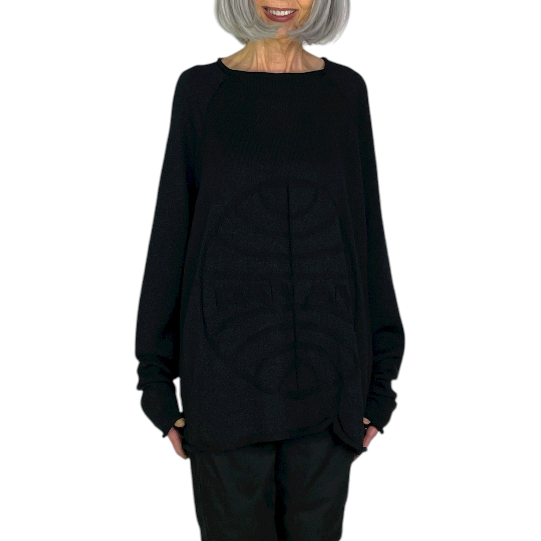 Jacquard knit pullover sweater with a round neckline and raglan long sleeves.  Wide silhouette.