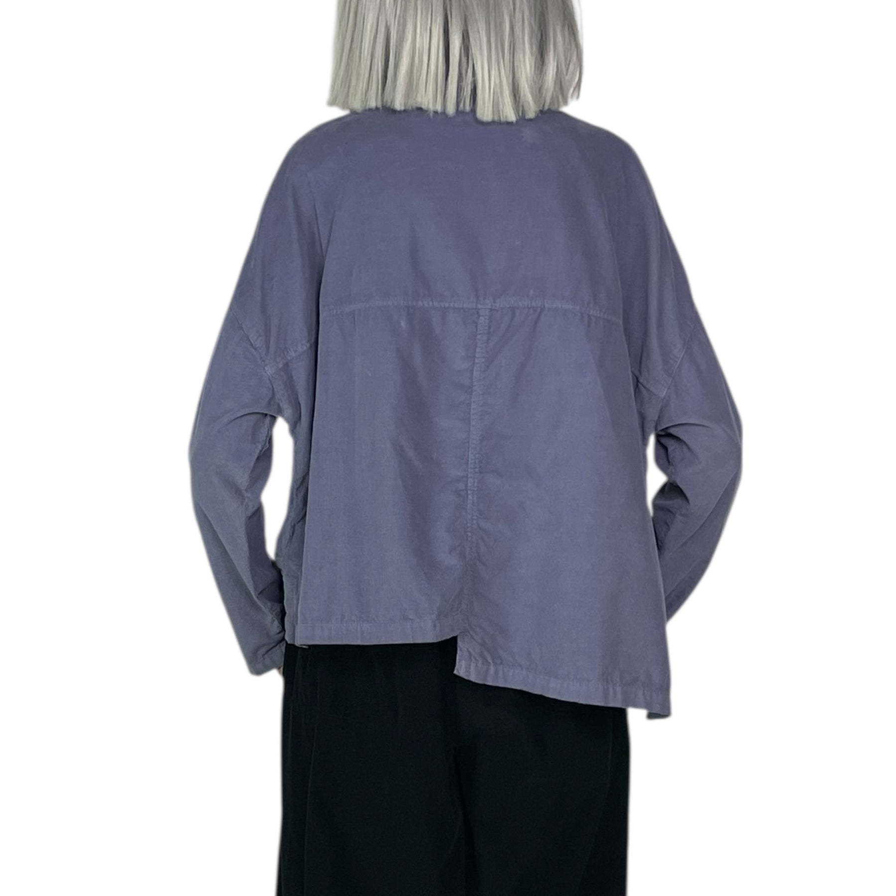Baby corduroy long sleeve button front shirt. Shirt collar and drop shoulders.  Asymmetric hemline with side slits.