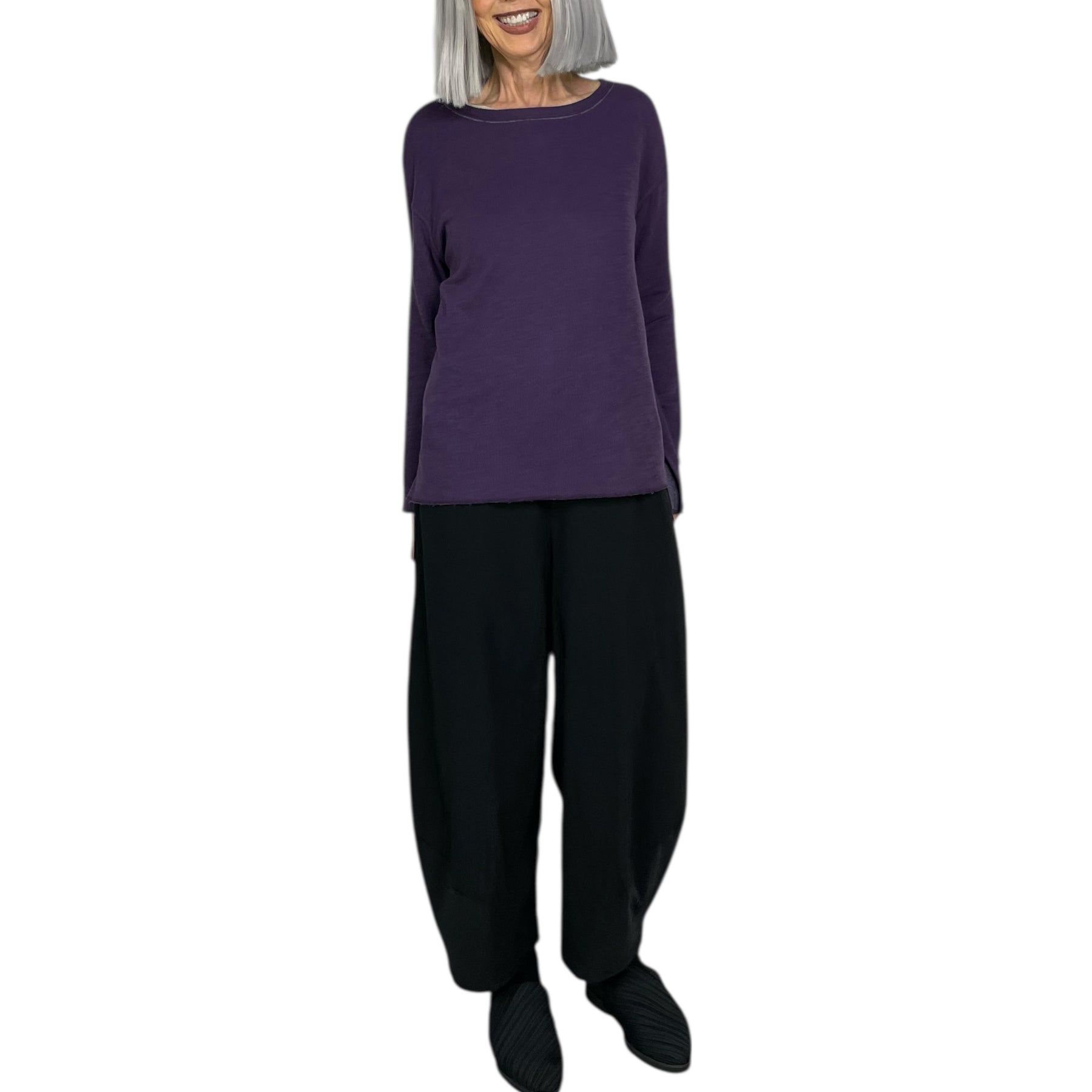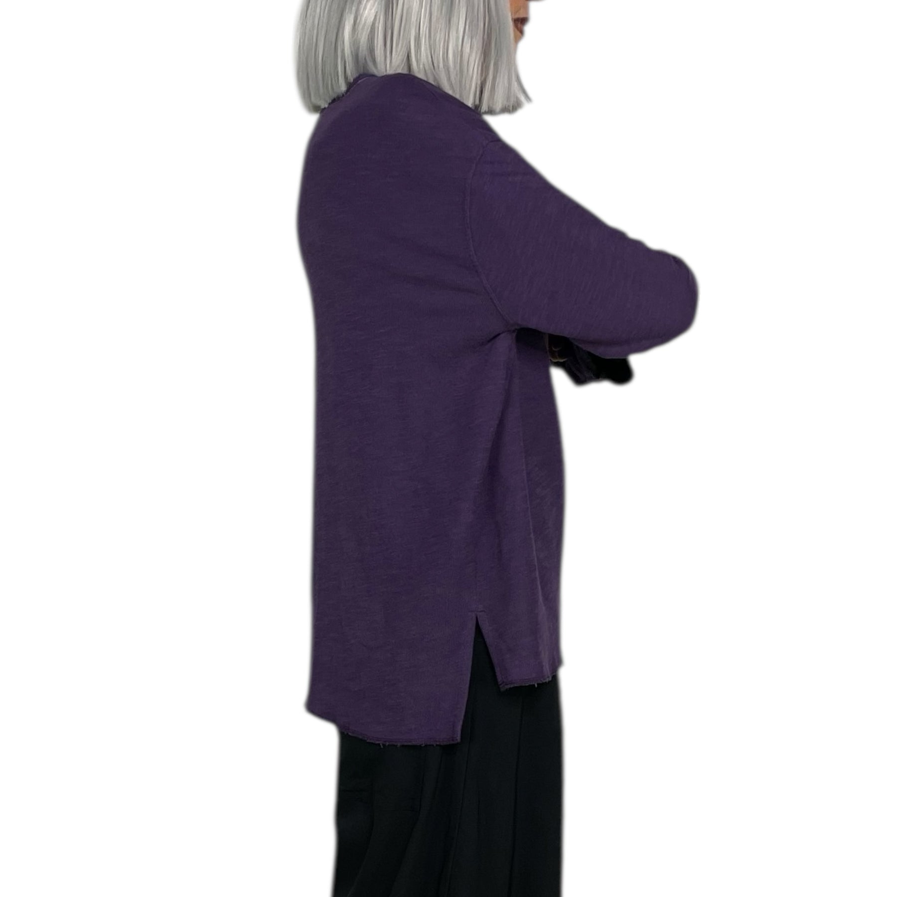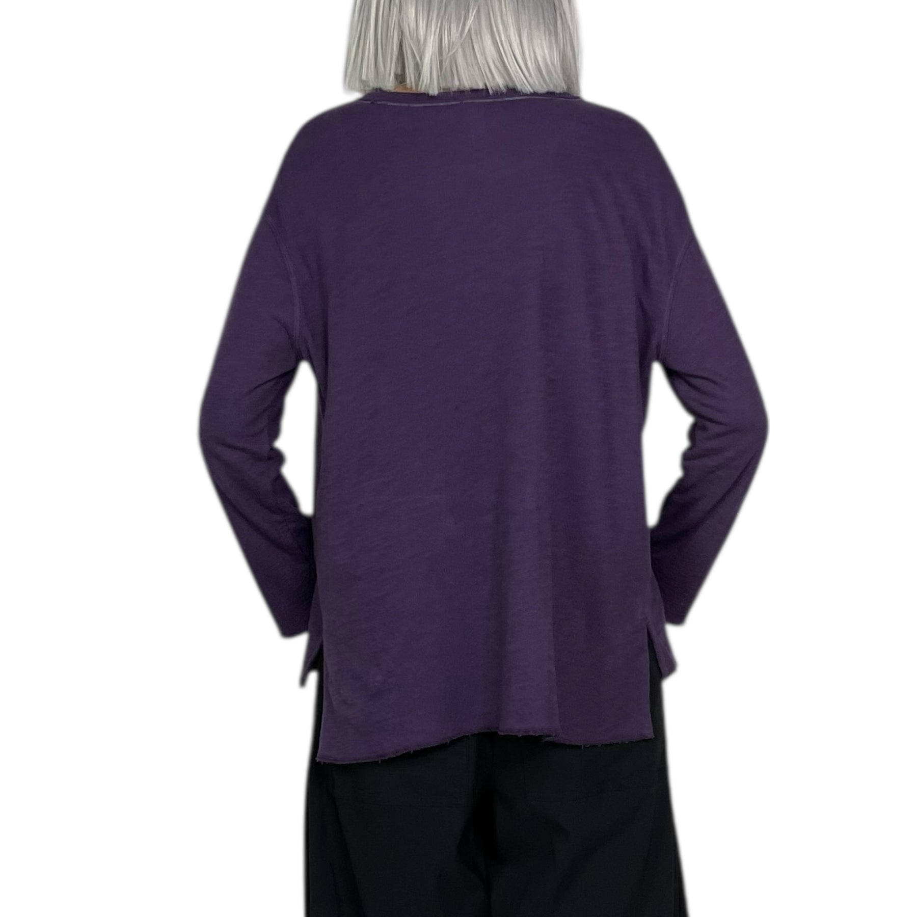Long sleeve crew-neck t-shirt with drop shoulders. A-line shaped, double layers with raw serged edges. Side slits and slightly longer back hemline