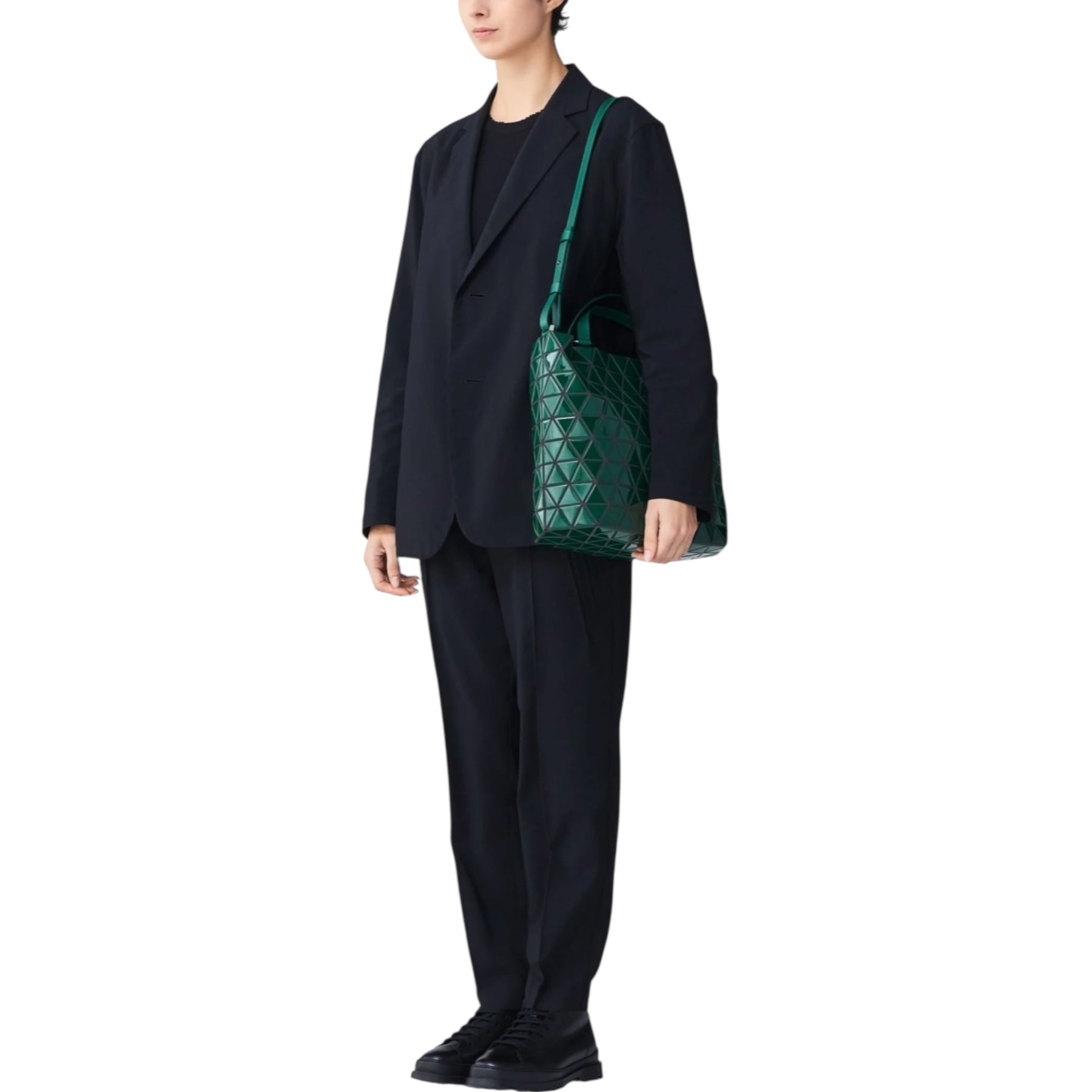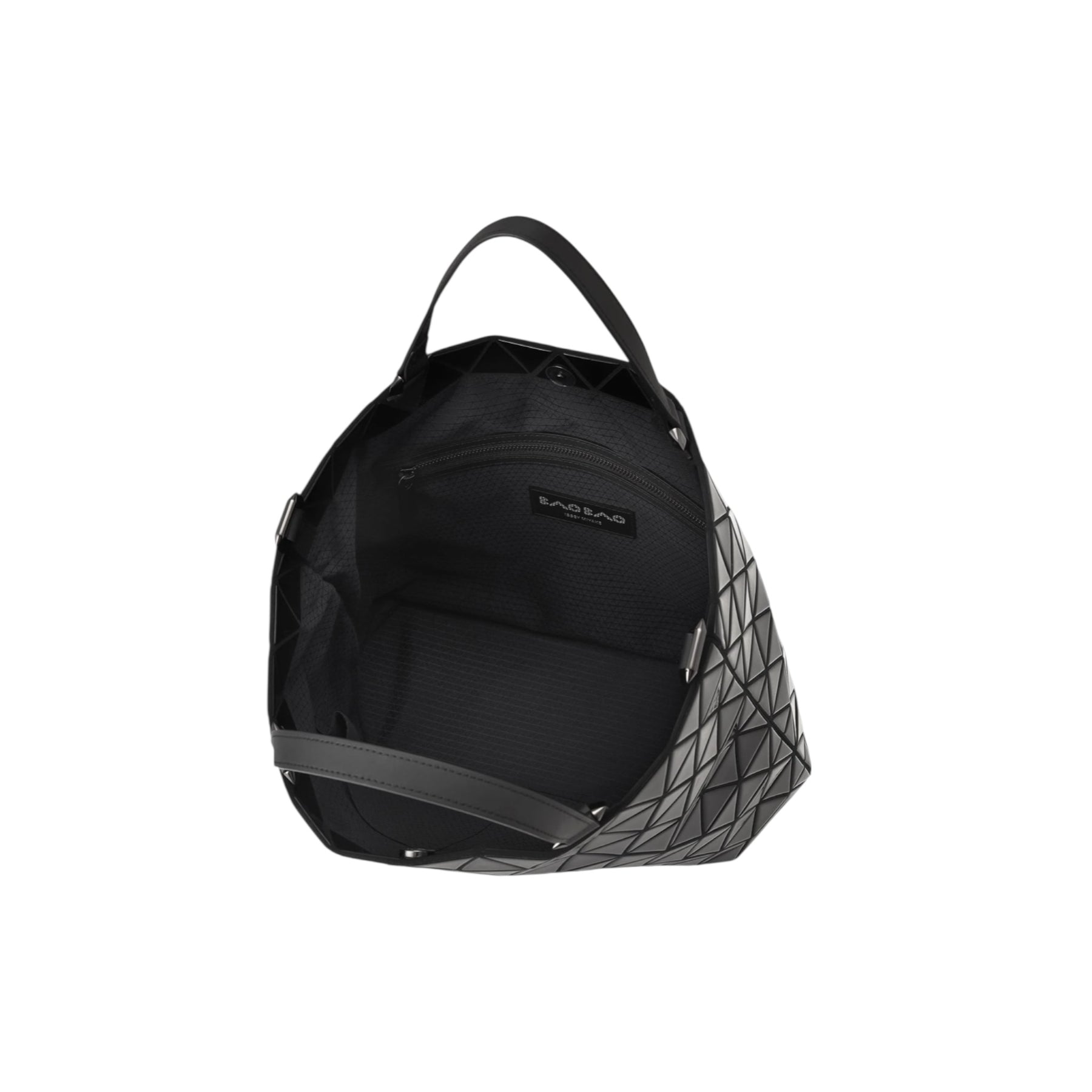 Double handle bag with magnetic snap closure and single interior zippered pocket.  Sits upright on its flat bottom.  Comes with a detachable adjustable strap to wear as a shoulder bag.