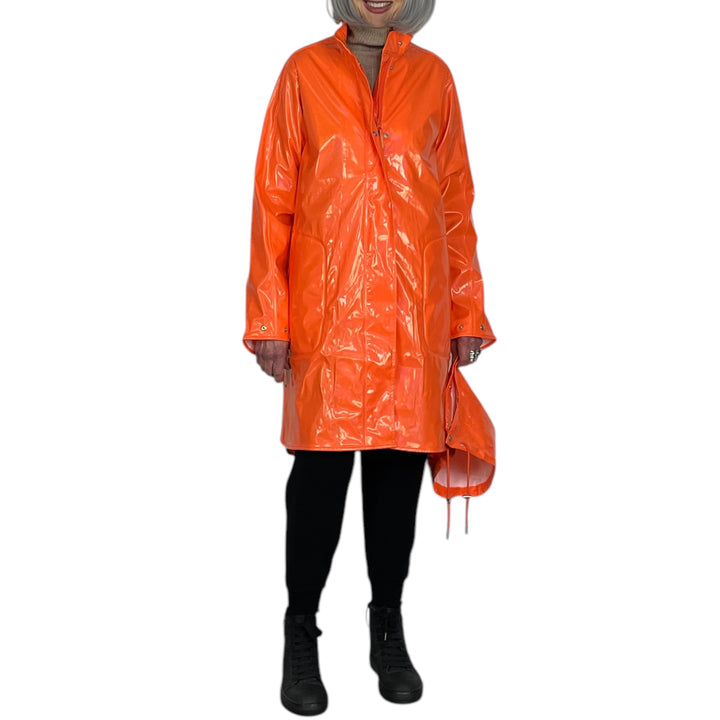 Waterproof raincoat with detachable hood and two front pockets.  Zipper and snap front closure, snaps at side slits, snaps at cuffs for adjustment.  Hi-lo hemline, welded seams.