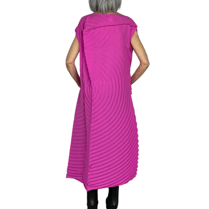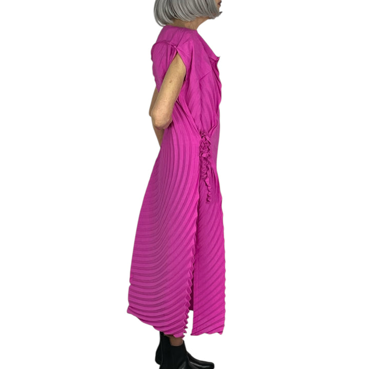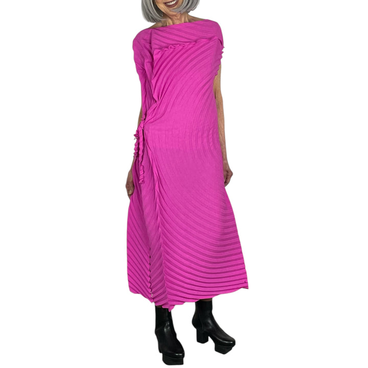 Sleeveless pleated dress with a boat neckline and side tie.  Curve pleated silhouette, single slit on one side.