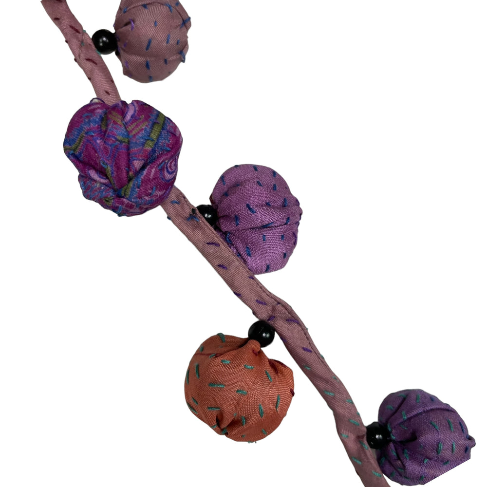 Soft hand stitched vintage silk beads on fabric cording necklace with glass beads in-between. Made with leftover Kantha fabric from clothing pieces for zero waste.