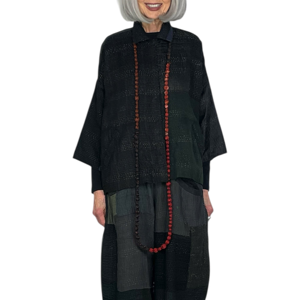 Long tie-beads necklace. Soft hand stitched vintage silk wrapped around wooden beads. Made with leftover Kantha fabric from clothing pieces for zero waste.