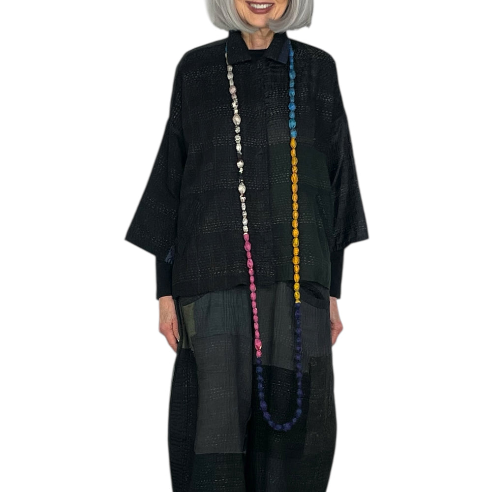 Long tie-beads necklace. Soft hand stitched vintage silk wrapped around wooden beads. Made with leftover Kantha fabric from clothing pieces for zero waste.