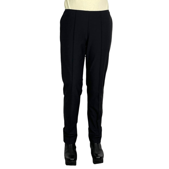 Slim leg pull-on pants with elasticized waistband and two side pockets. Center seam detail on legs.