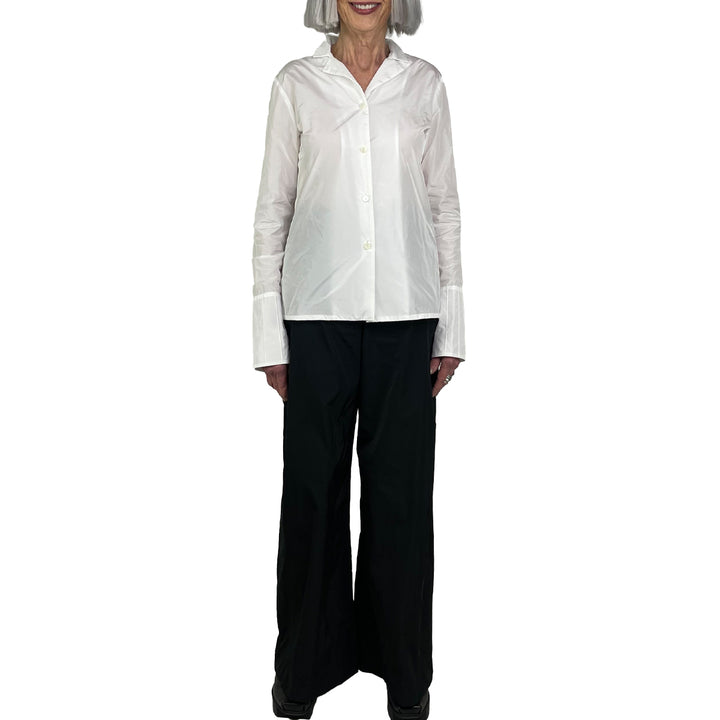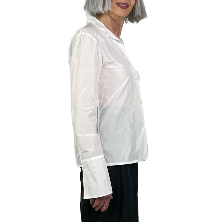 Notch collar button front shirt. Elongated single button cuffs with seaming detail.