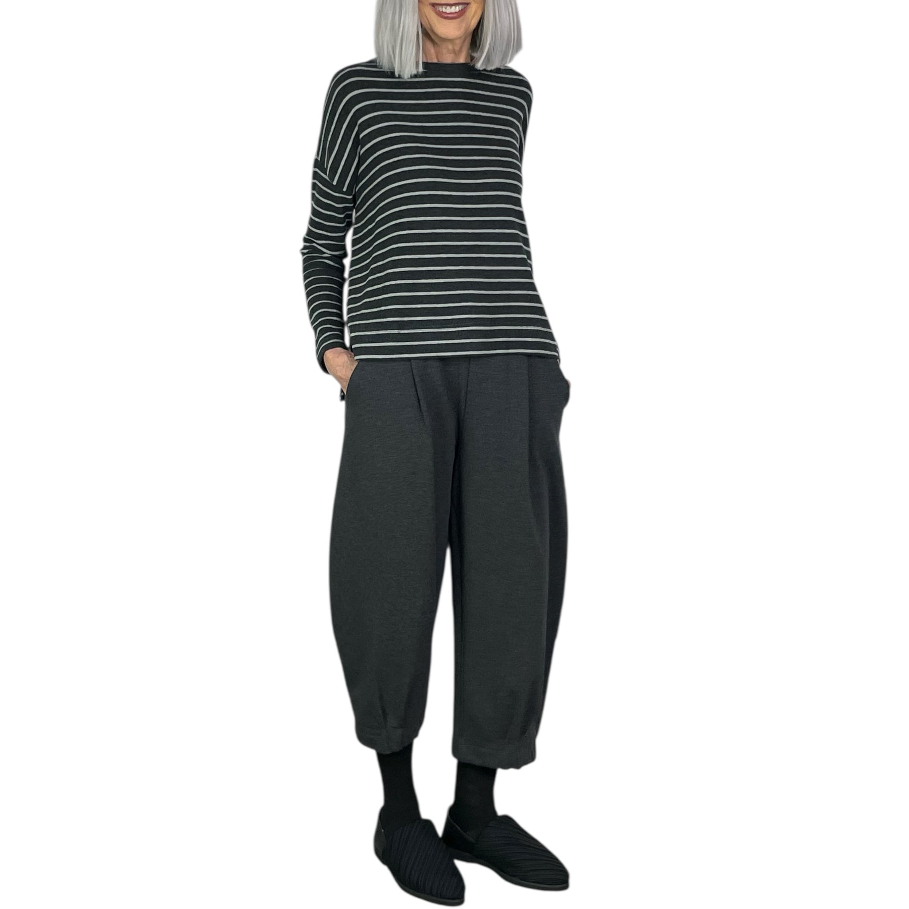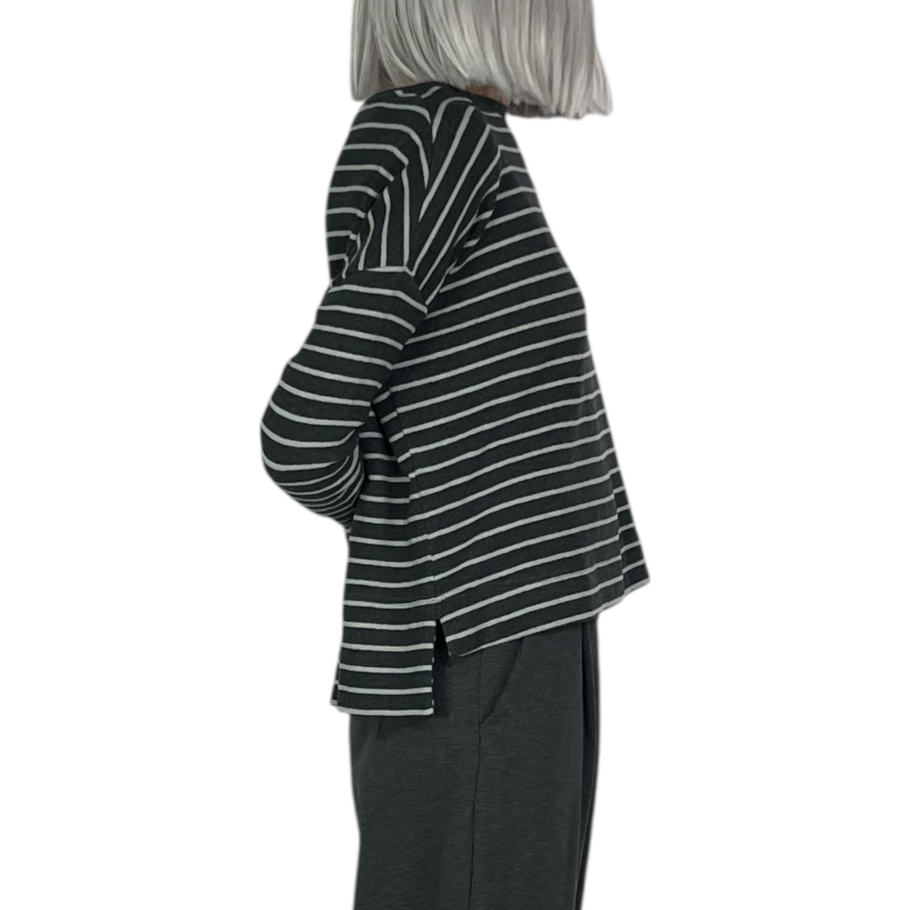 Fleece crewneck striped top with long sleeves and drop shoulders. Side slits at hi-lo hemline.