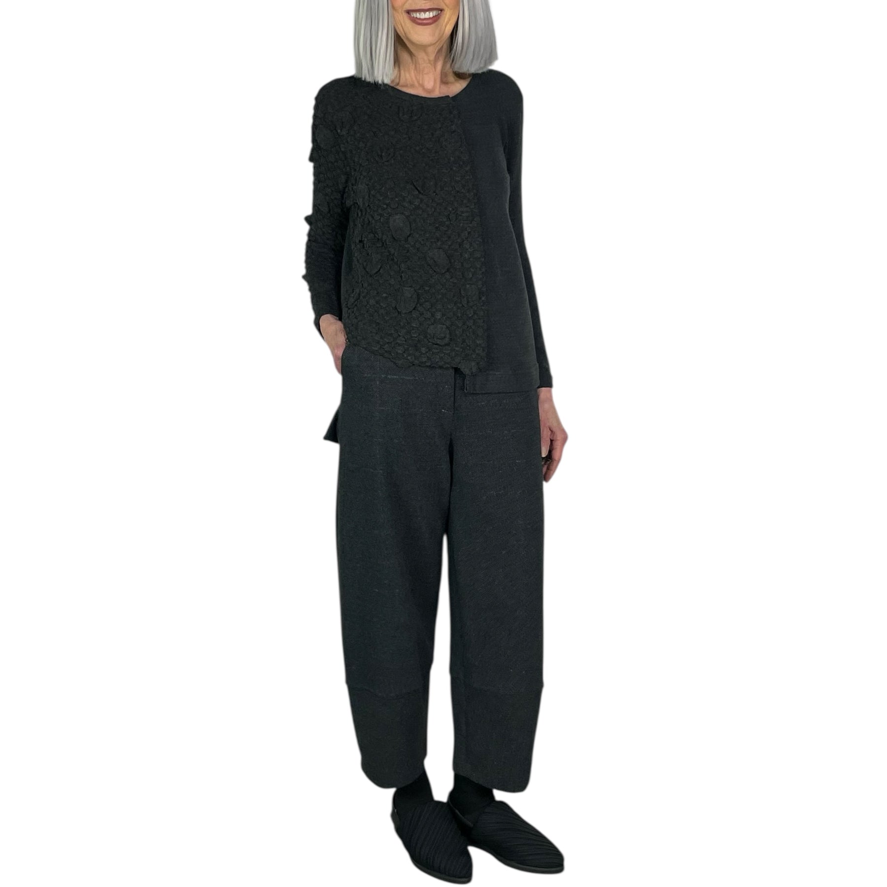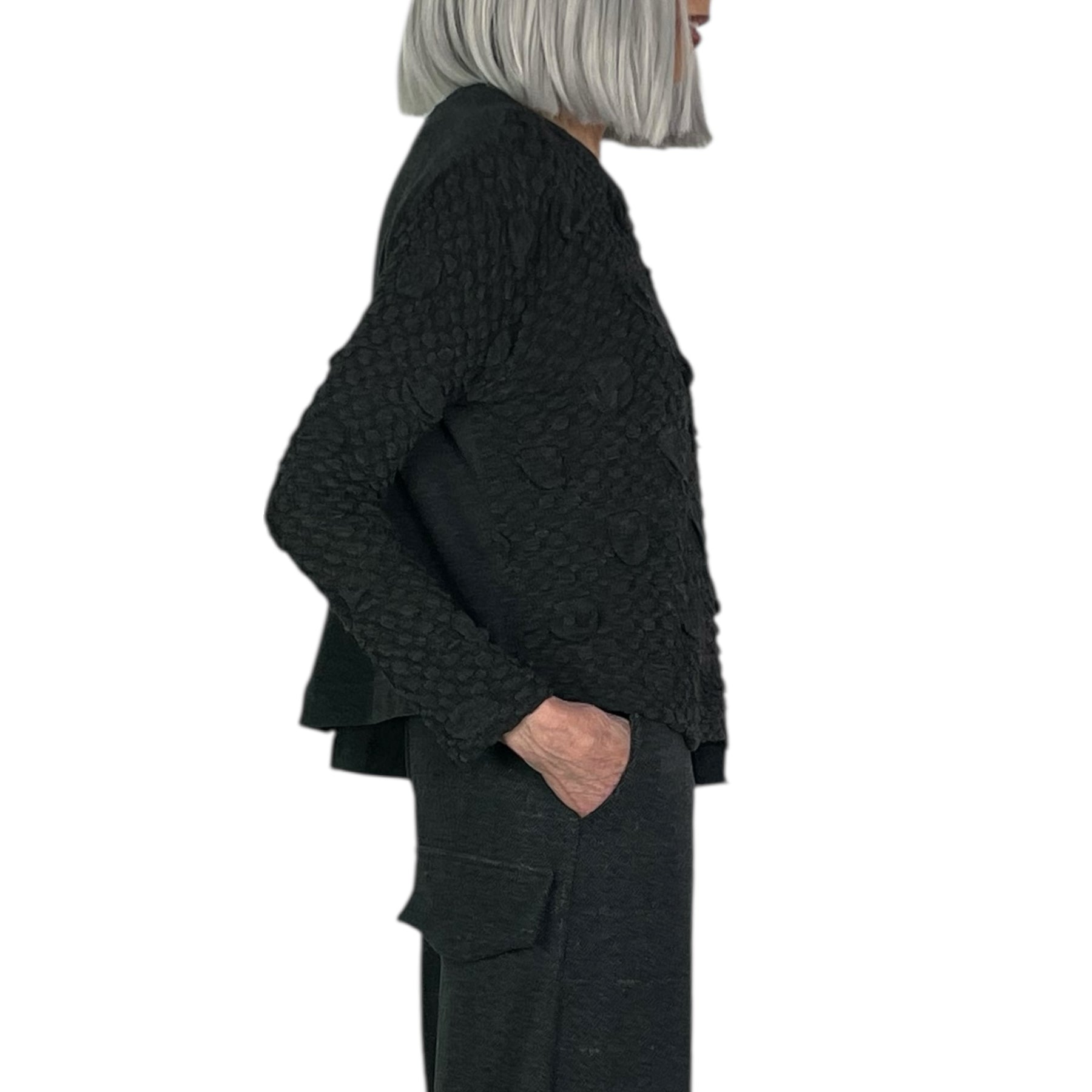 Long sleeve crew-neck pullover with an asymmetric hemline. Half fleece flat knit, half bubble textured knit. Slit at center back.