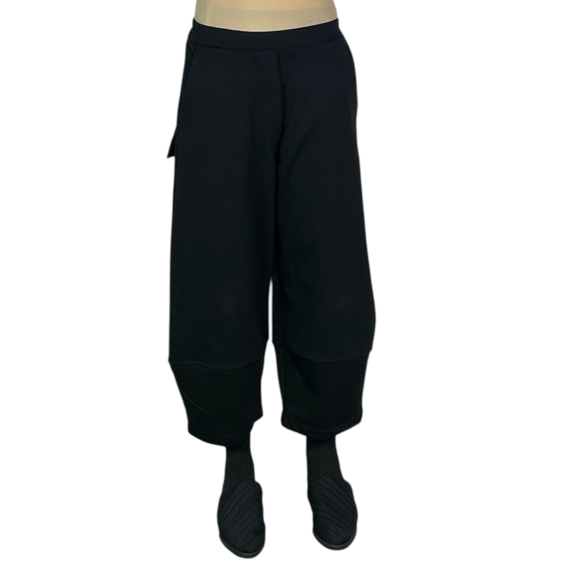 French terry curved leg pant with elasticized waistband and faux fly front. Two side pockets, single back flap pocket at hip.