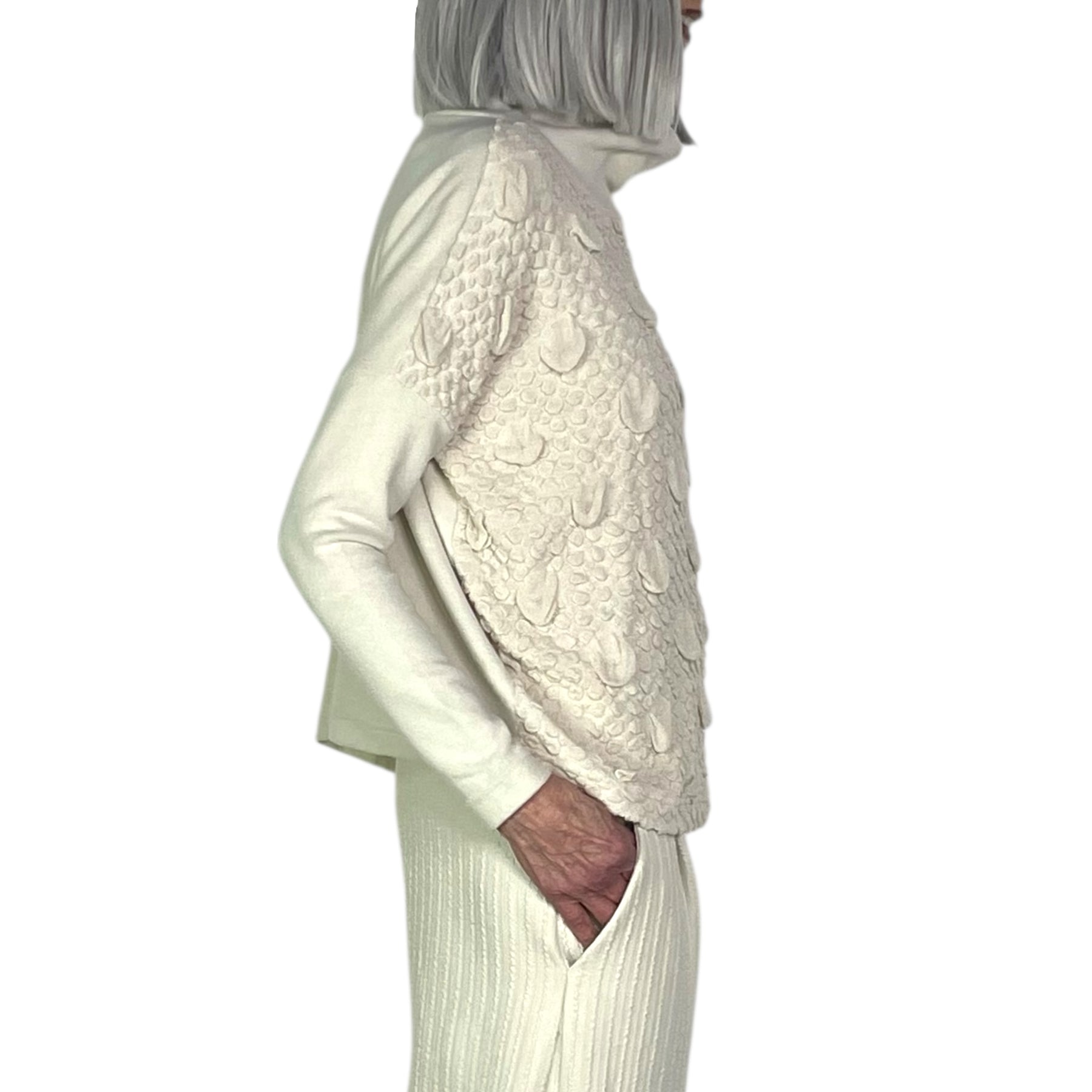Fleece flat knit long sleeve cowl neck top with drop shoulders and bubble textured knit front.