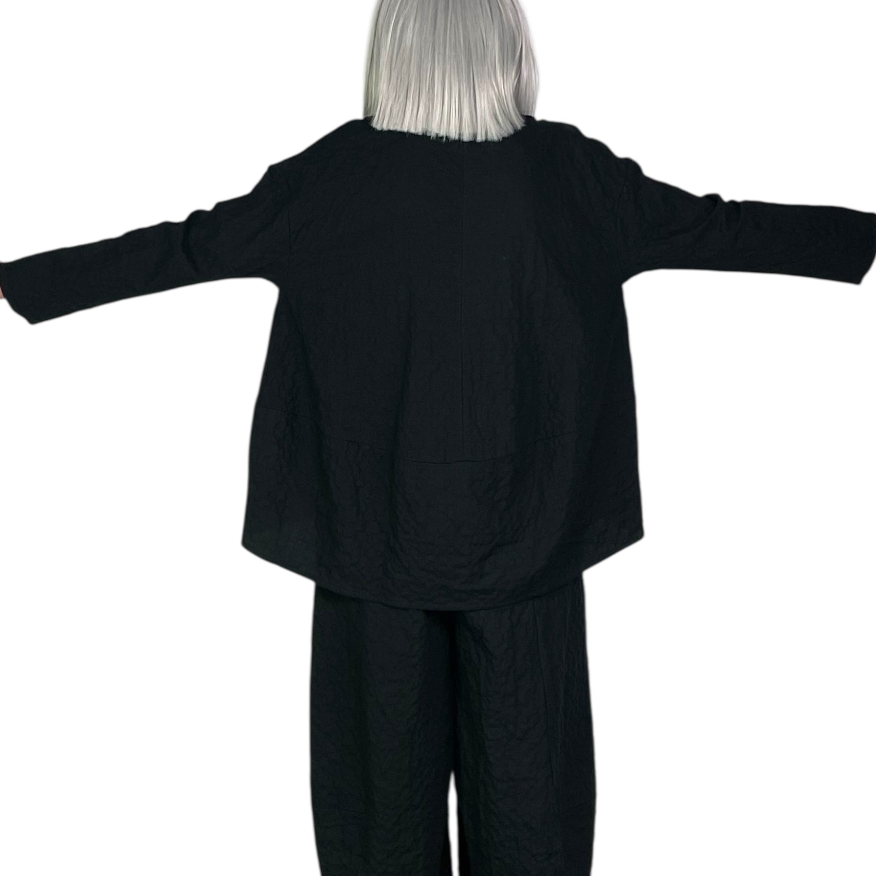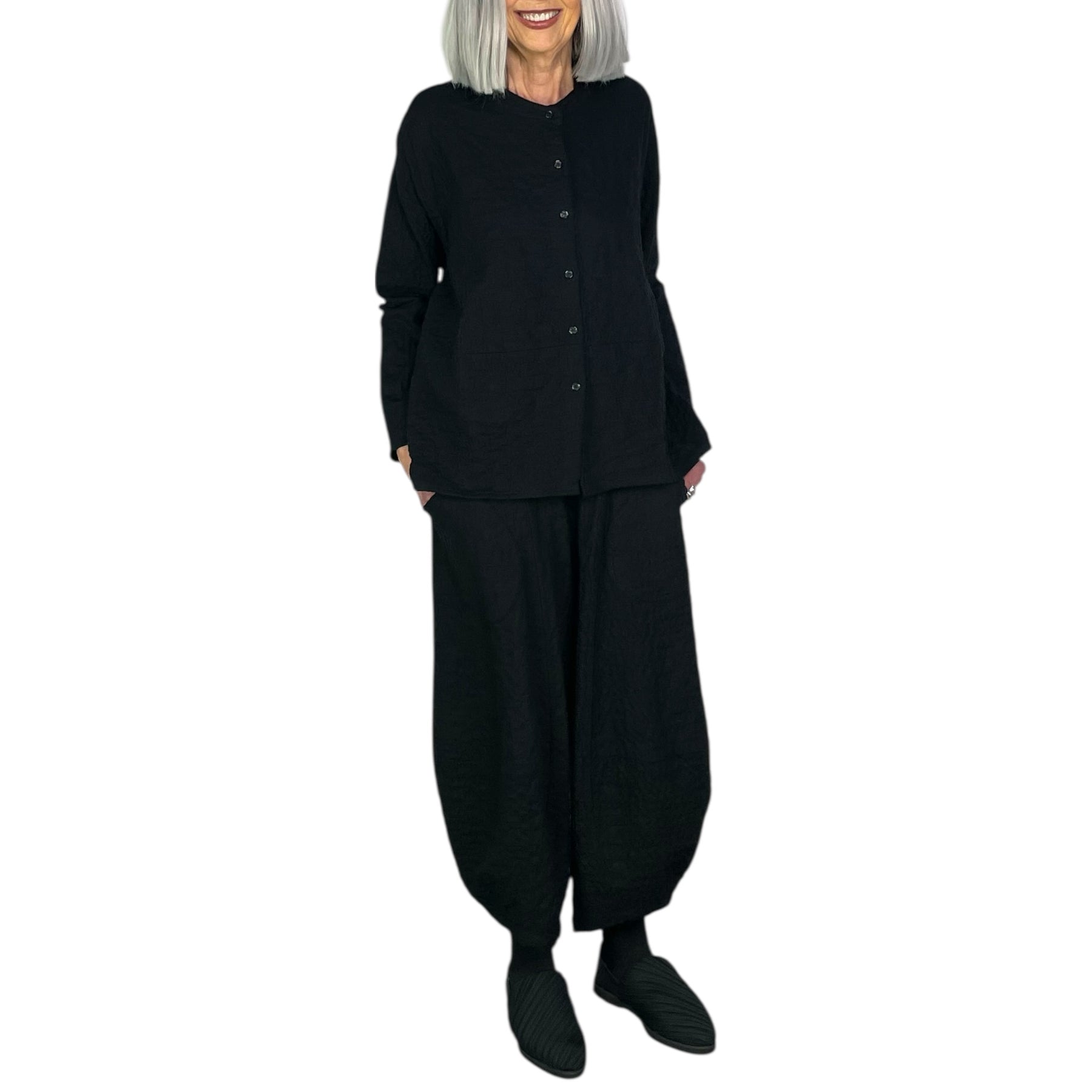 Textured cotton gauze shirt with a mandarin collar and button front closure. Curved shape silhouette.