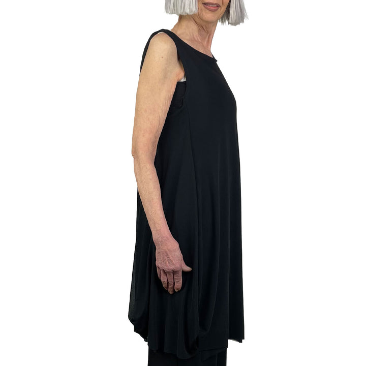 Nylon mesh dress with double layered overlapping front panels. Sleeveless with a wide round neckline. Raw edges throughout.