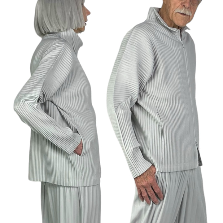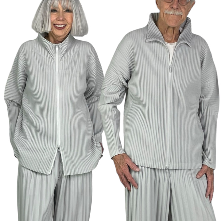 Unisex pleated long sleeve 2-way zip front jacket. Funnel neck, two side pockets, straight shape.
