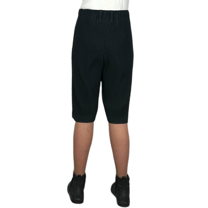 Unisex over the knee pleated shorts with an elasticized waistband and two side pockets. Button fly front, straight leg, slim fit.