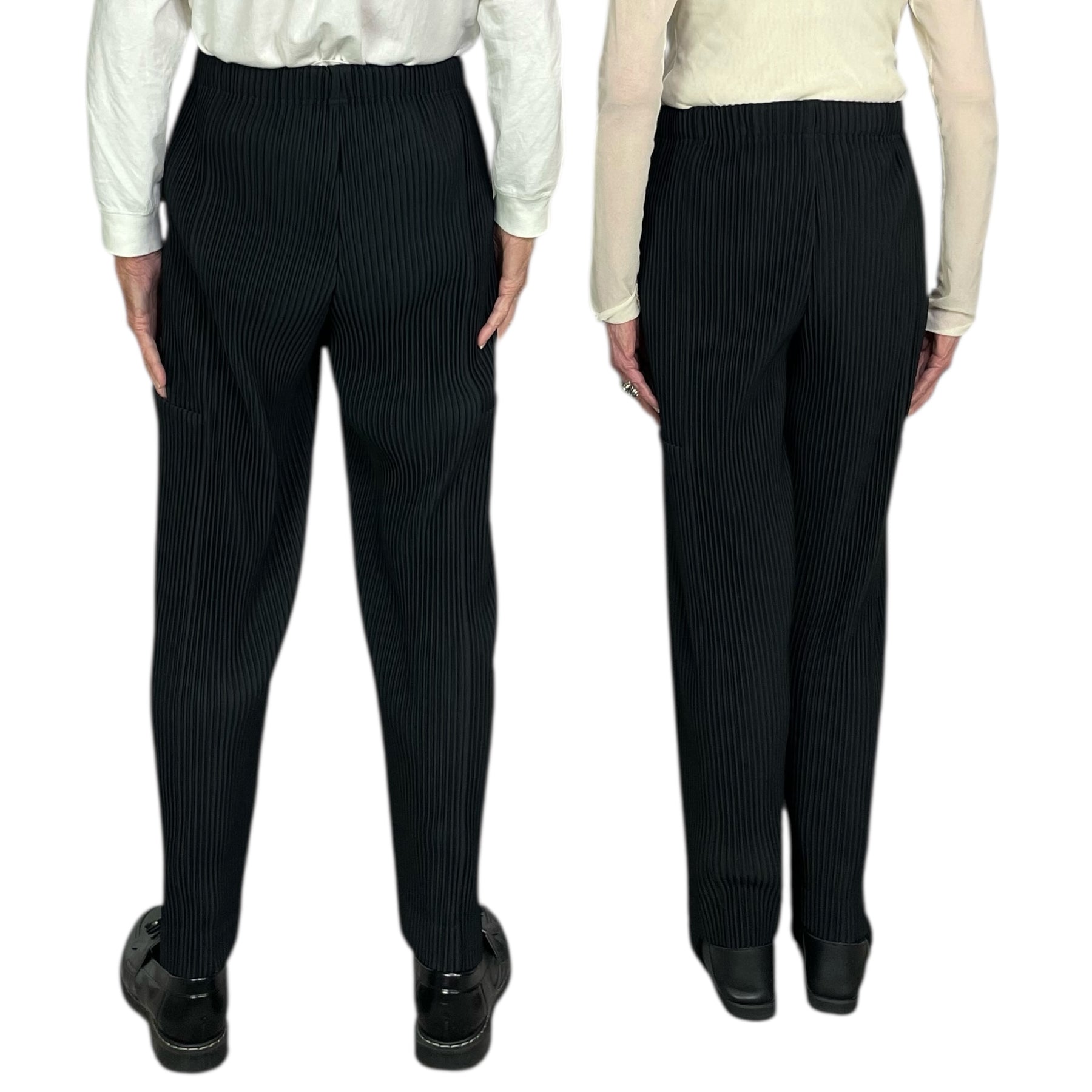 Unisex pleated pant with button fly and elasticized waistband with drawstring adjustment.  Two on-seam side pockets and two snap thigh pockets.