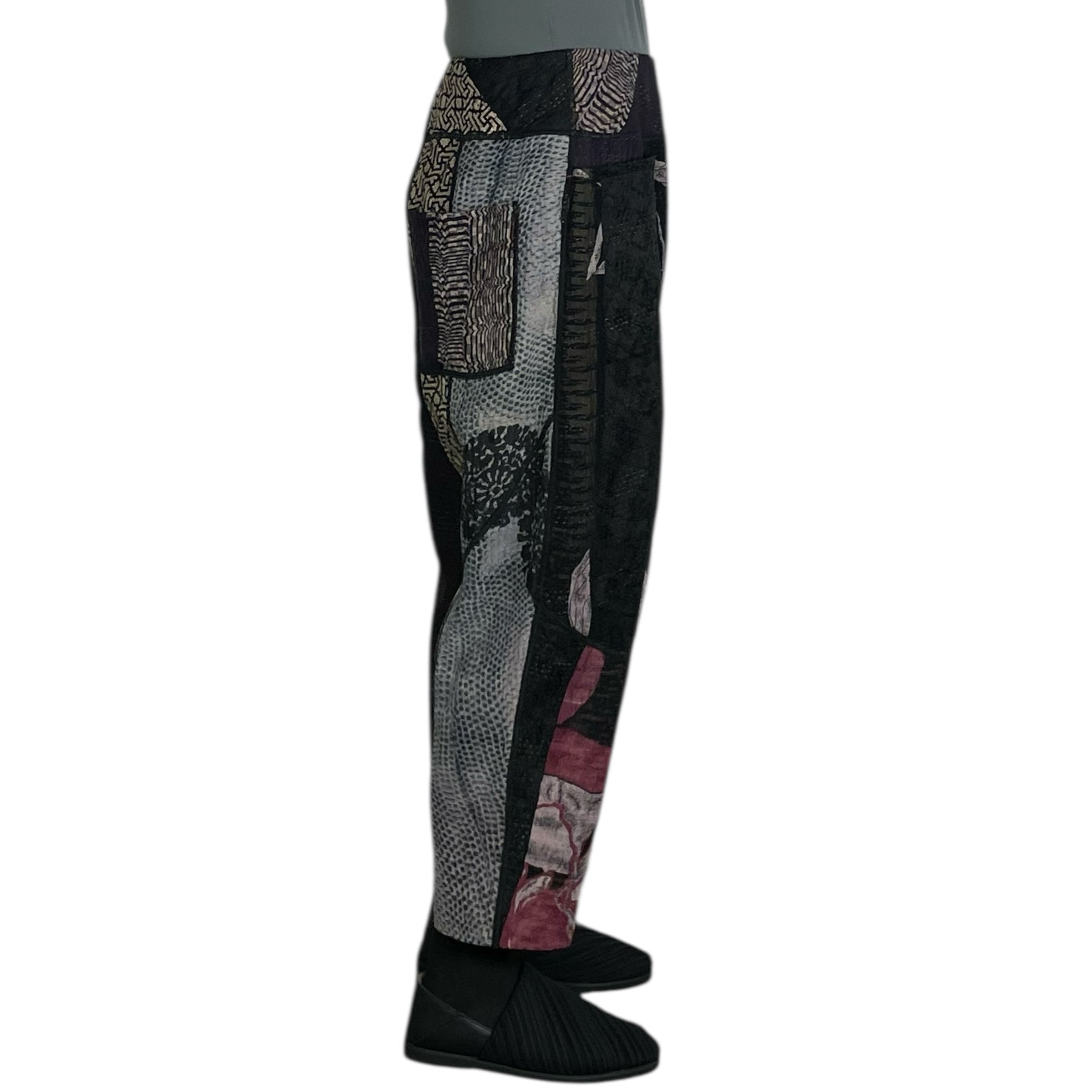 Reversible pull-on pant with silk jacquard panels and elasticized waistband. Front and back pockets on front side, front pockets only on reverse. 4-layer vintage kantha with hand stitching throughout. Lantern shaped legs, relaxed fit.