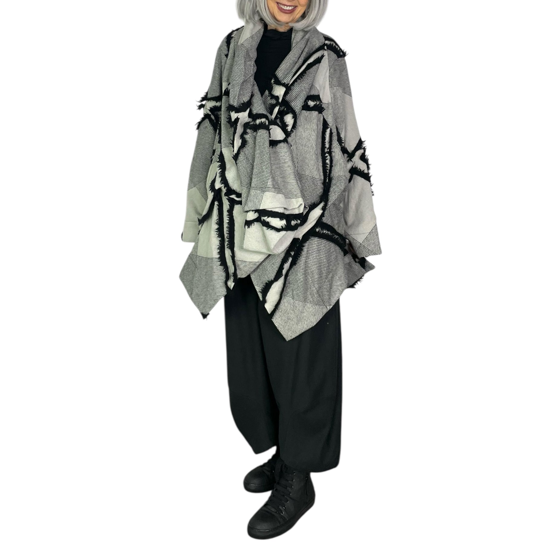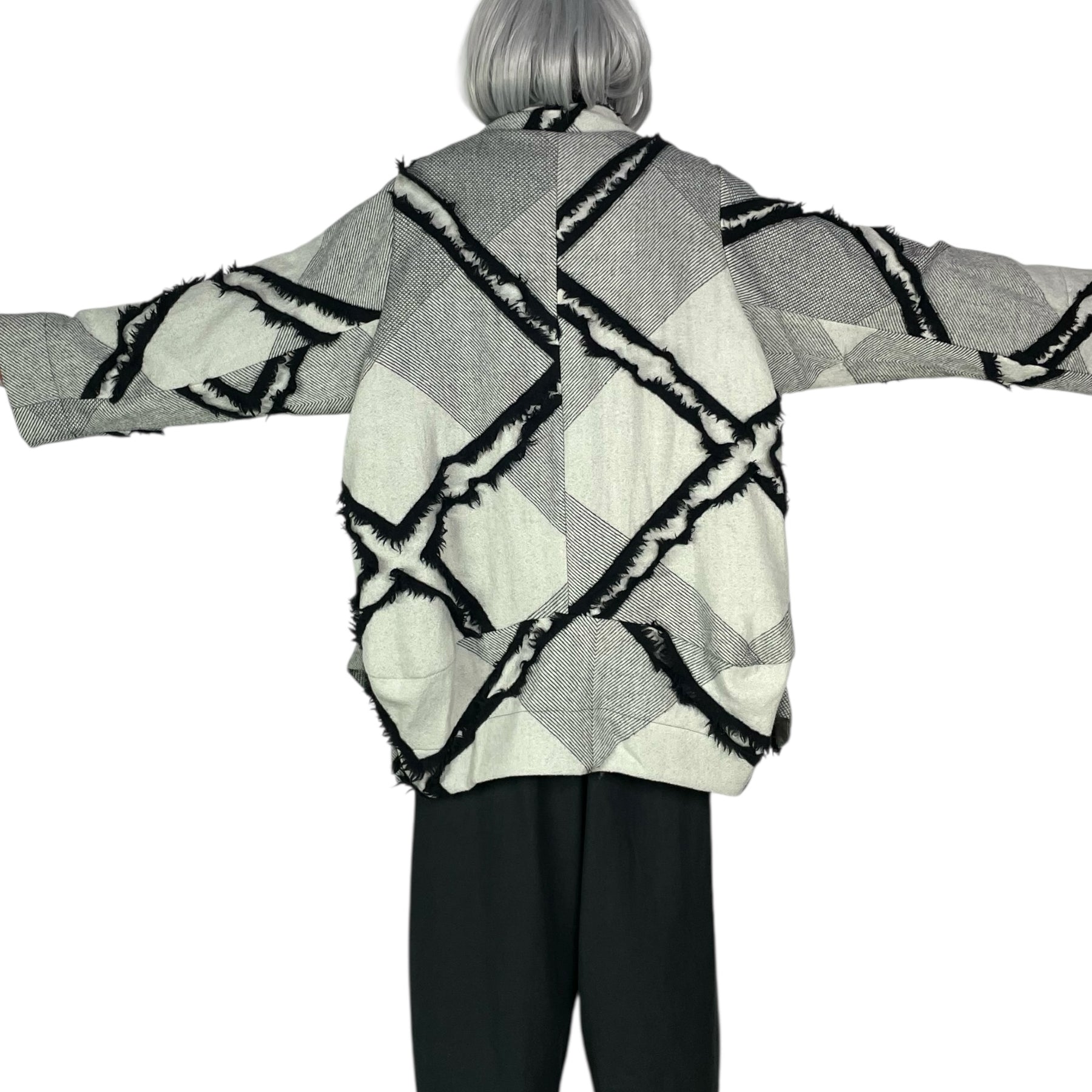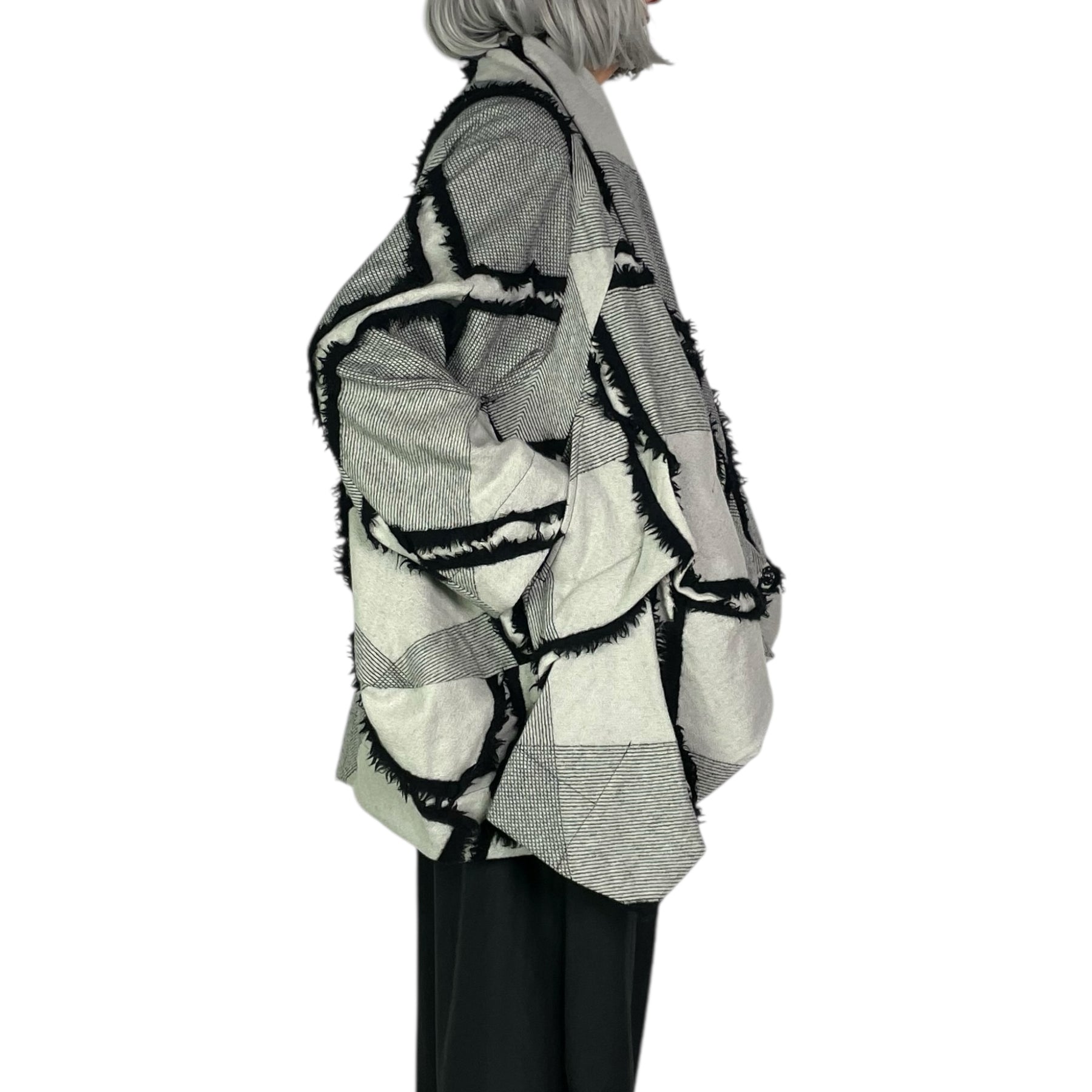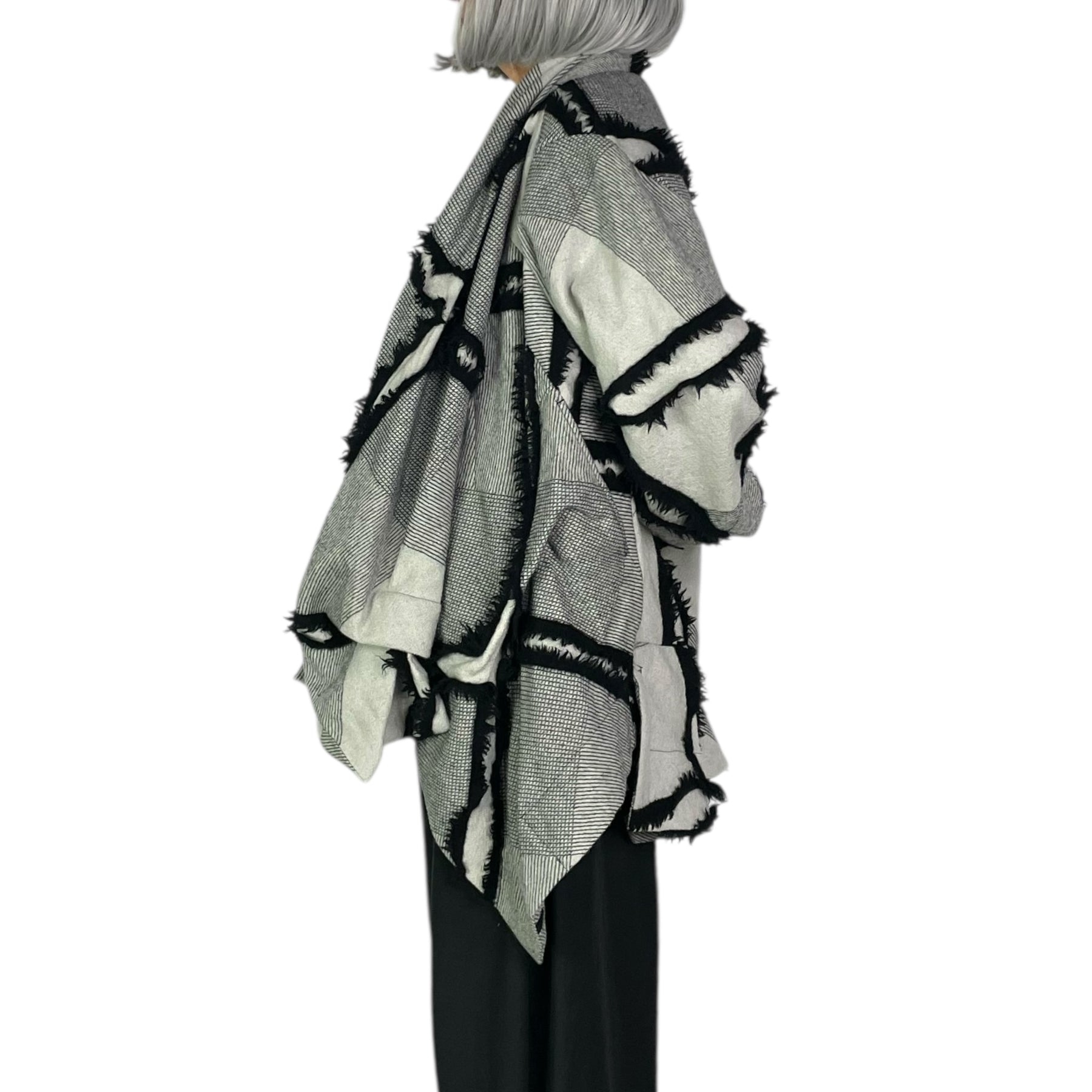 Long sleeve jacket with cross-over interior snap closure. Draped collar and softly sculpted front. Two side welt pockets. Shaped back.