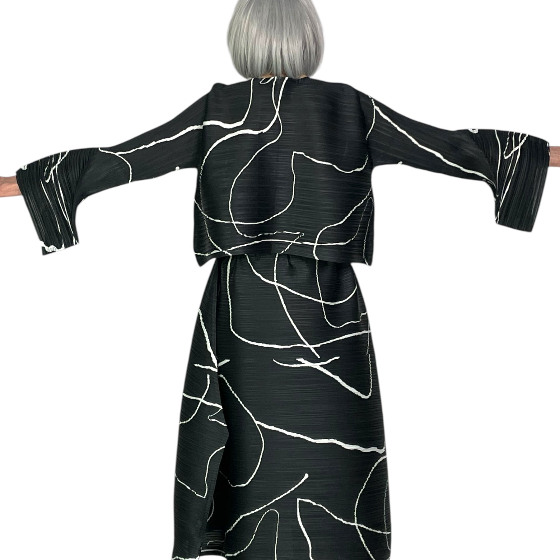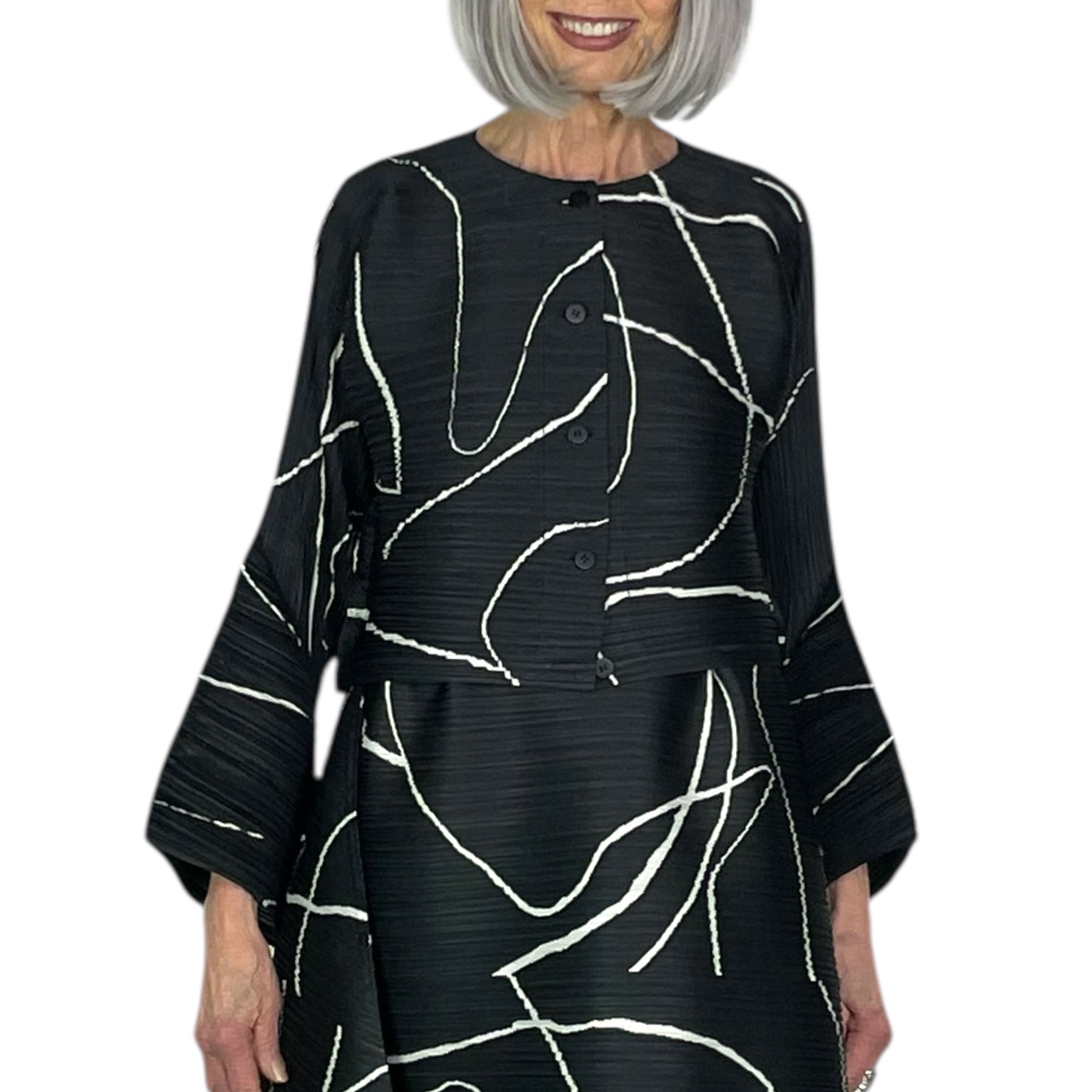 Horizontal pleated short jacket with a round neckline and button front closure. Long sleeves with extended cuffs create a flared silhouette.