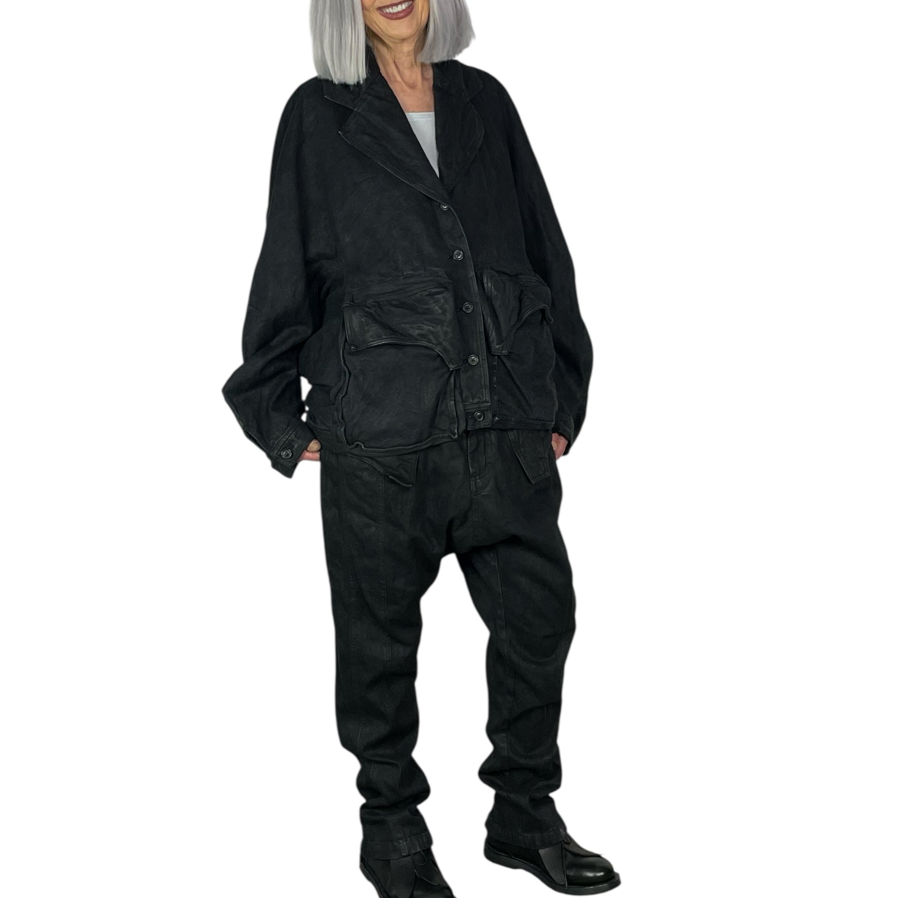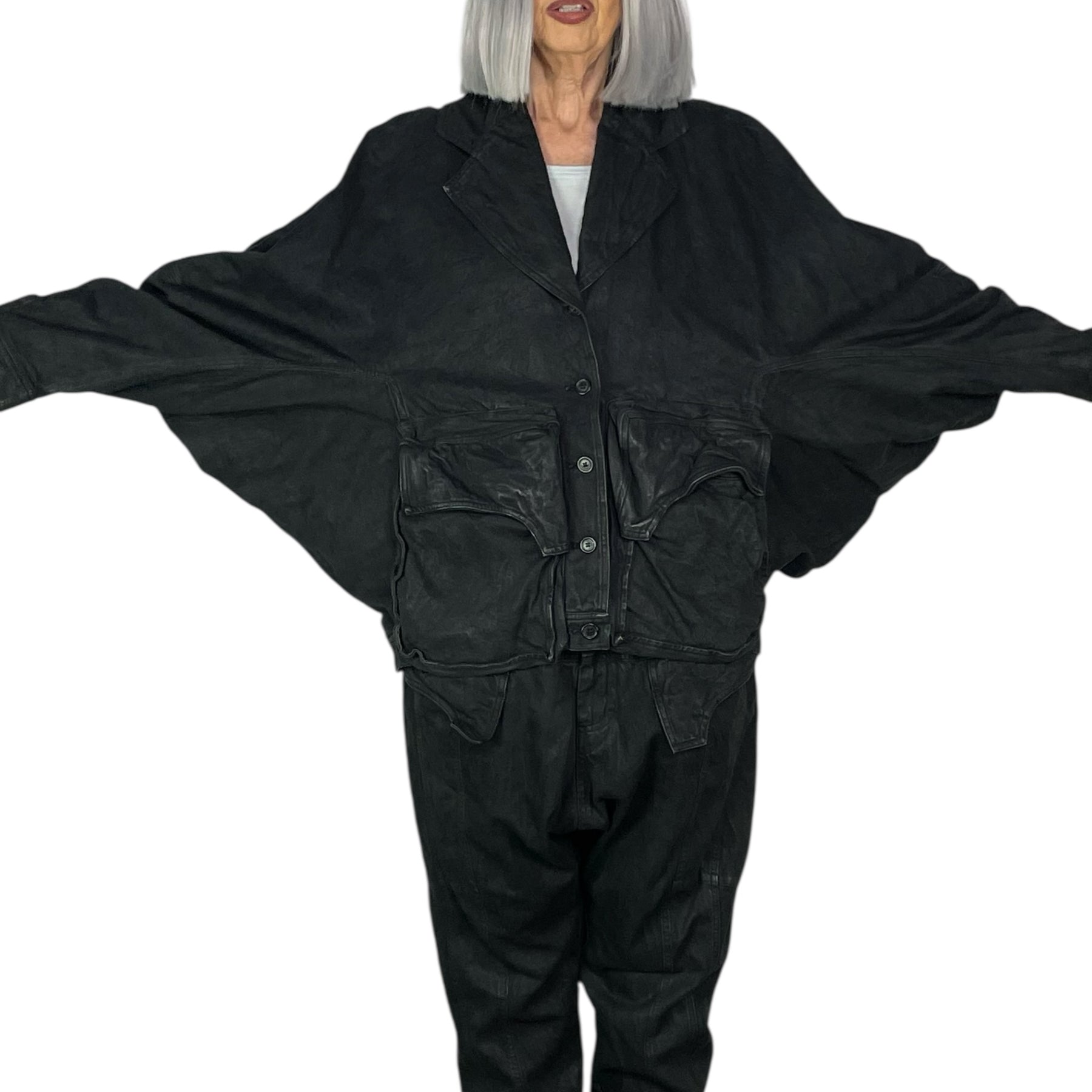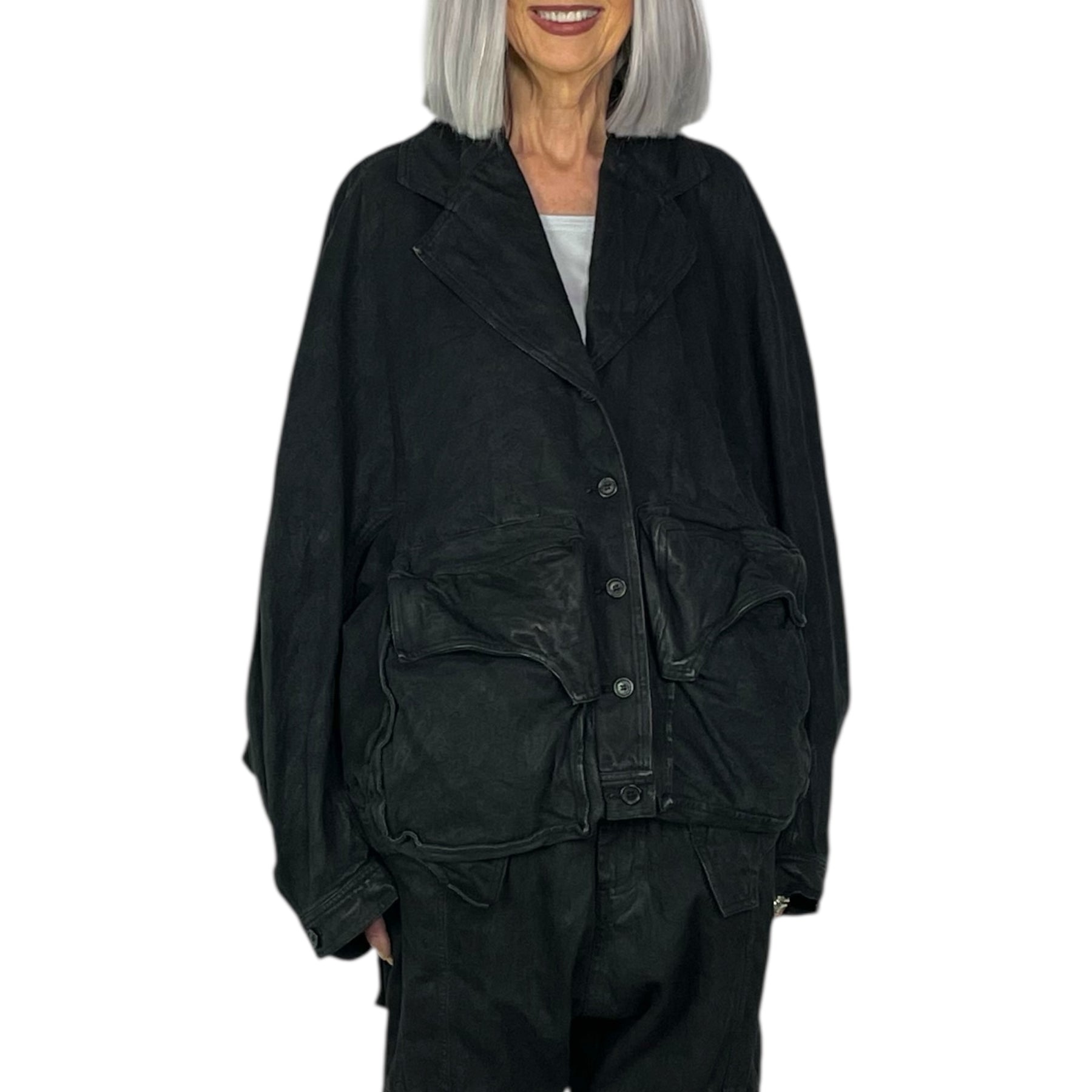 Dolman sleeve denim jacket with a wide notch collar and button front closure. Two large gusseted flap pockets on front. Button cuffs and button tabs at back banded hemline.