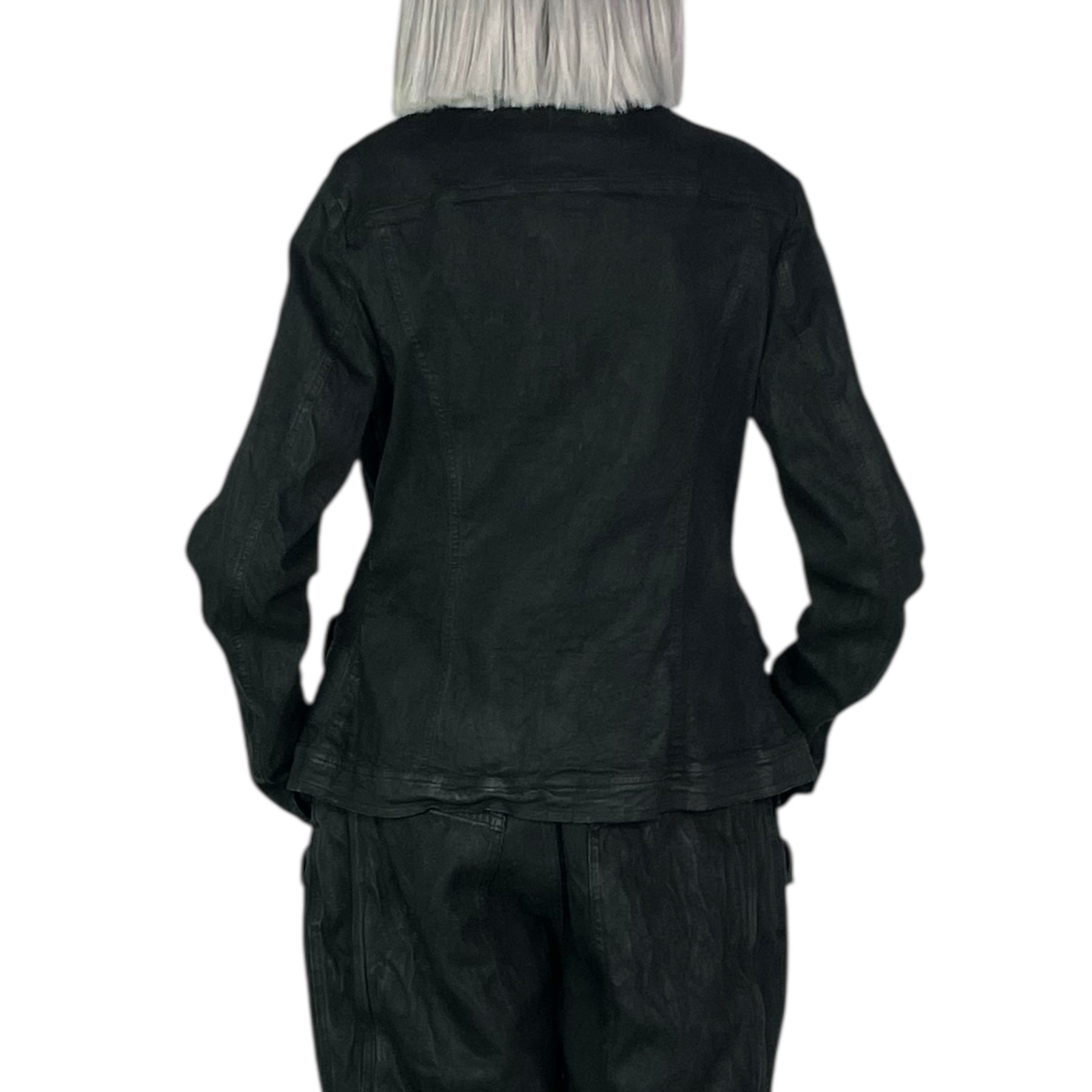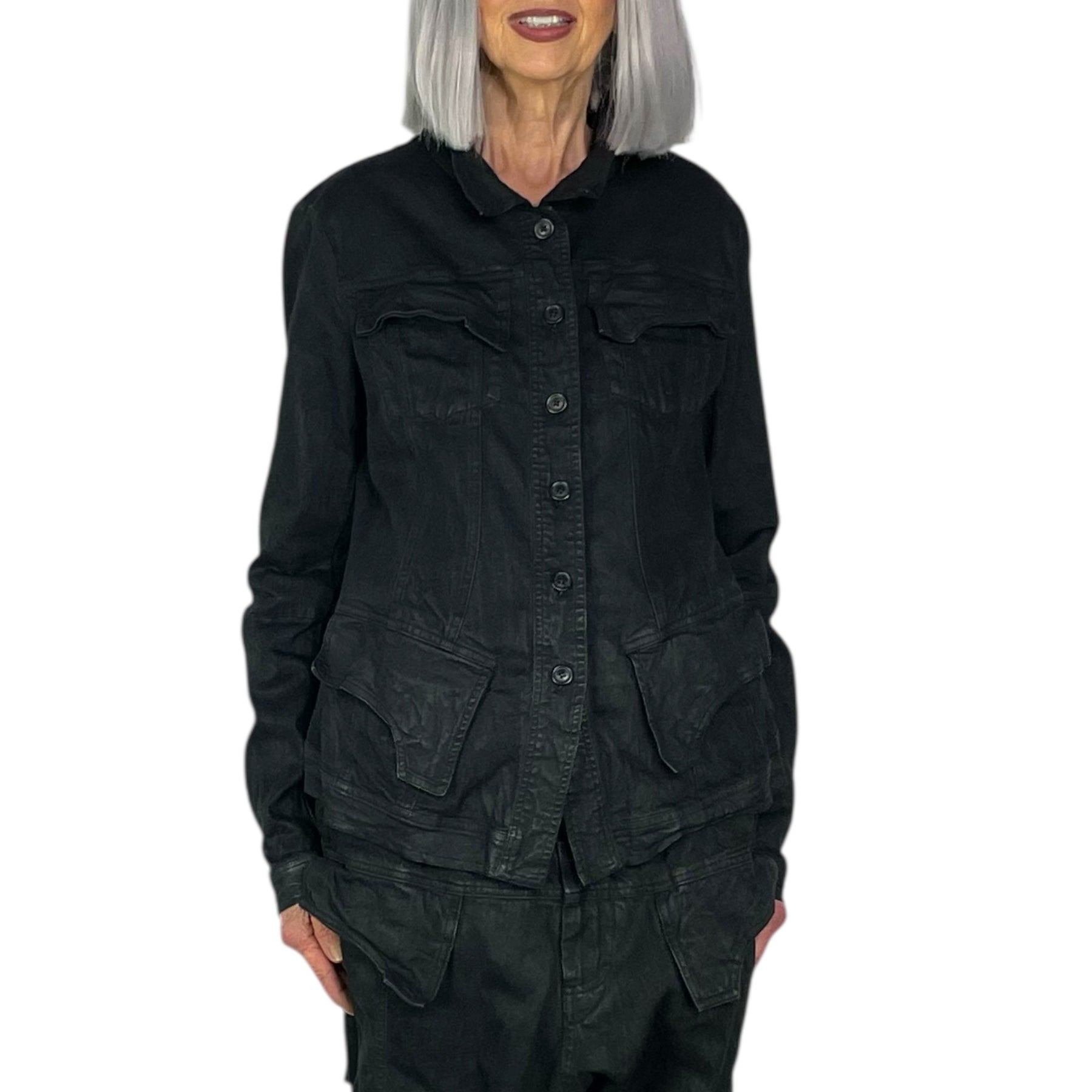 Long sleeve denim jacket with a small collar and button front closure. 4 front flap pockets, button cuffs, and banded hemline.