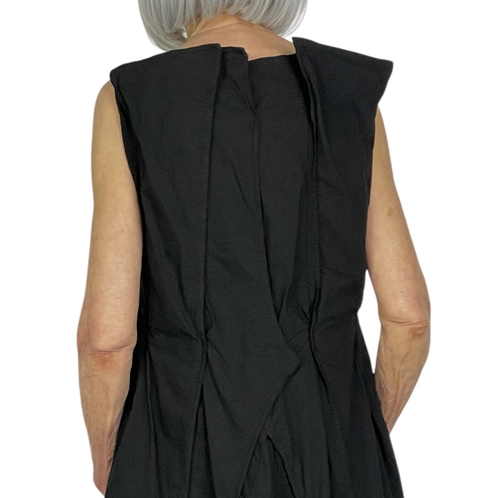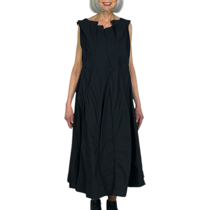 Sleeveless dress with two side pockets. Shaped bodice, full skirt. Seamed panel detailing.