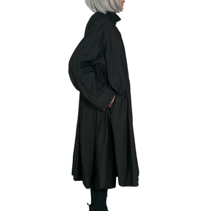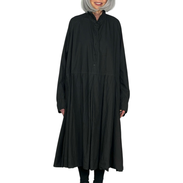 long sleeve dress with a small collar and half button front closure. Raglan sleeves with button at cuffs. Two side pockets at box pleated skirt. Oversized fit.