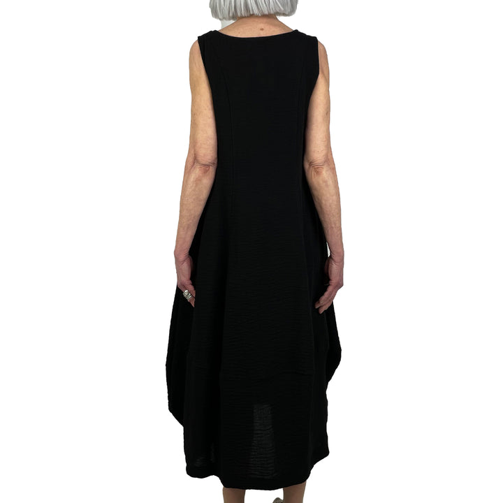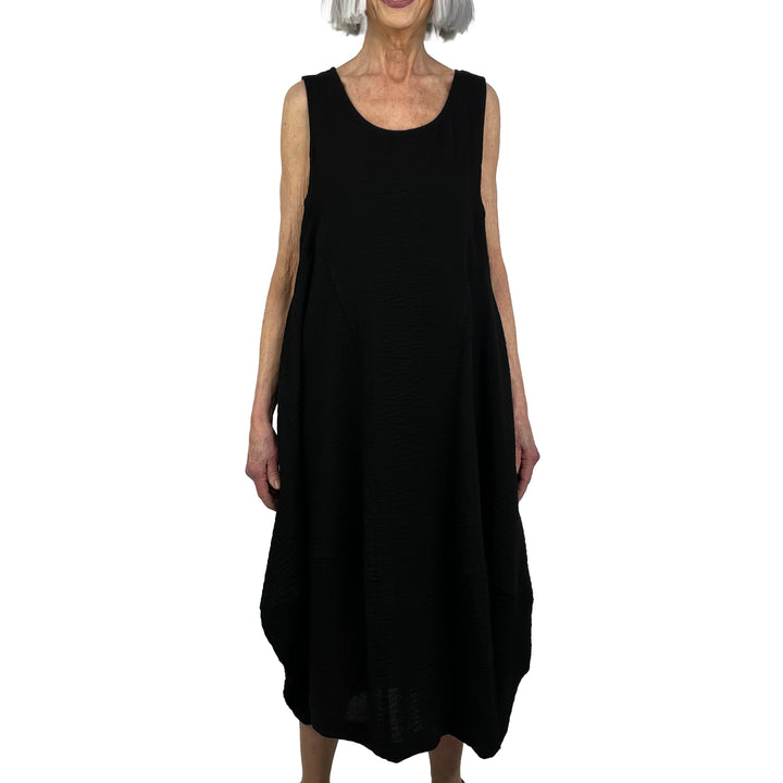 Sleeveless round-neck dress with tulip shaped bottom. Travel crinkle fabric.