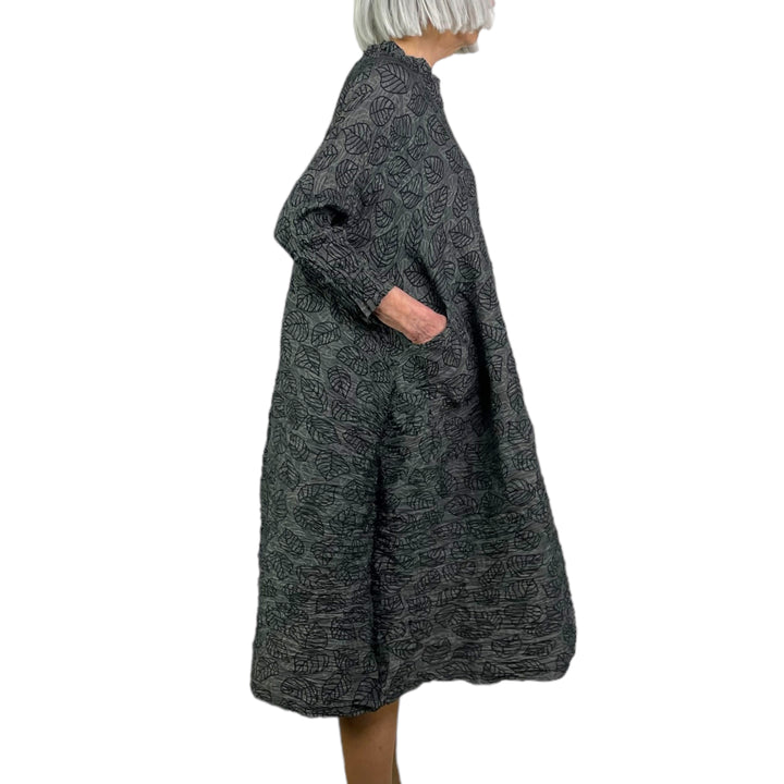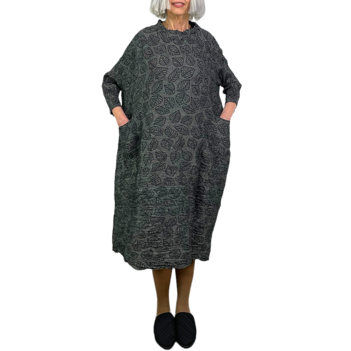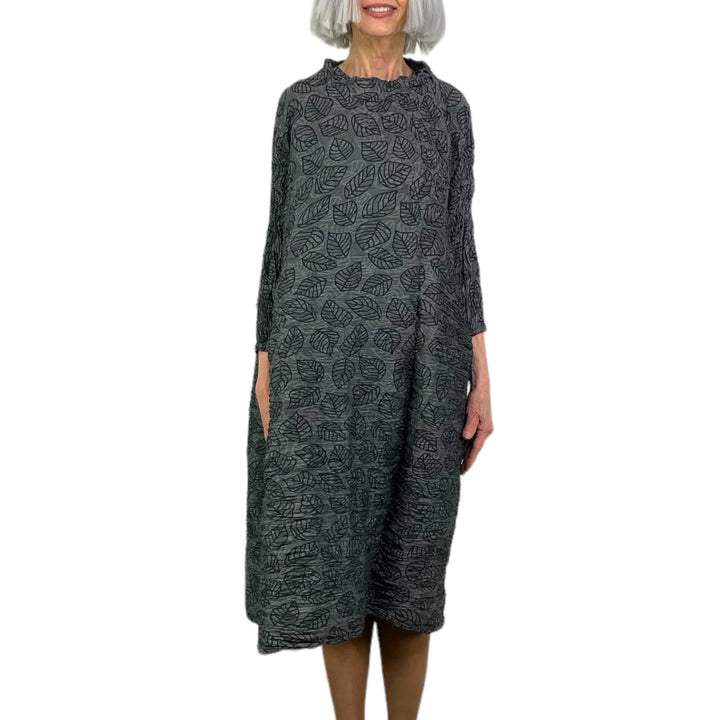Leaf print jacquard and horizontal pleated dress with round neckline and two front pockets. Wide silhouette.