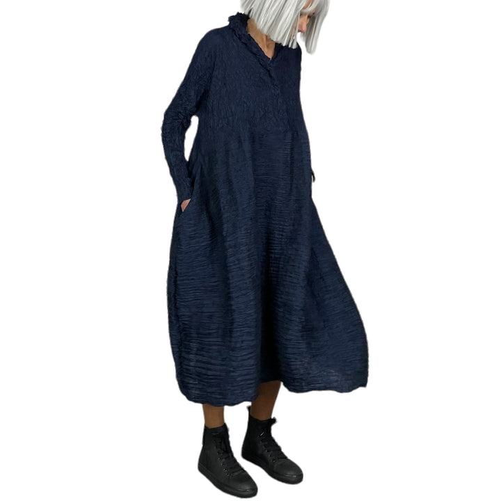Long sleeve dress with two side pockets and empire waistline. Small hood with crossover collar and snap closure. Crush pleat bodice, horizontal pleat skirt.