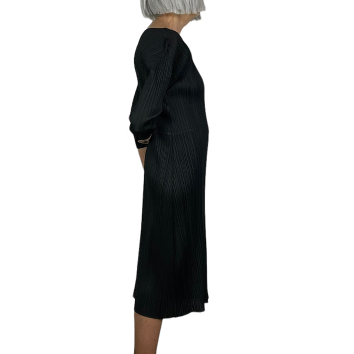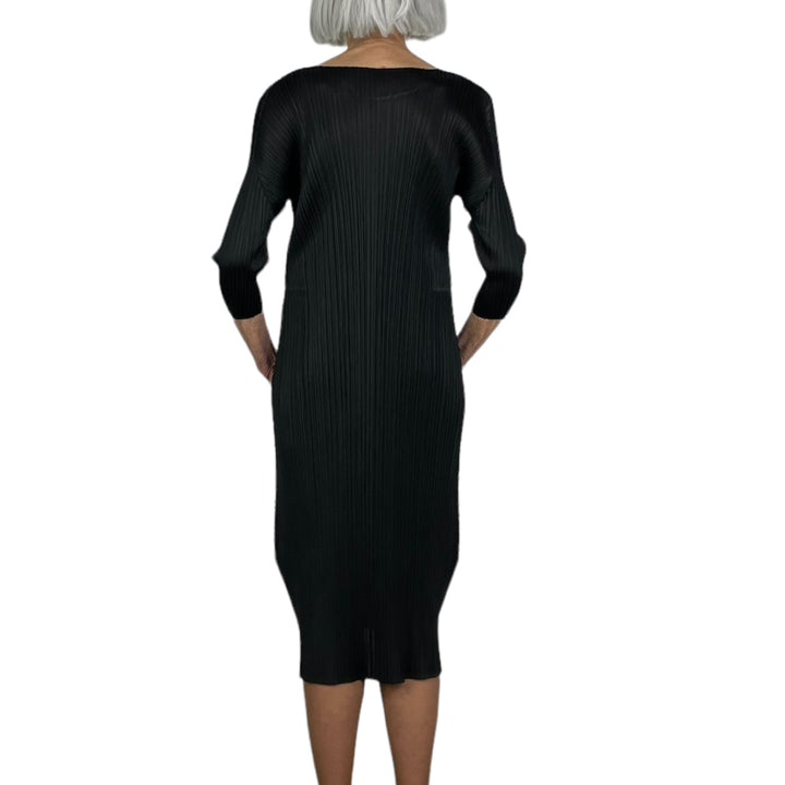 Pleated dress with a round neckline and 3/4 sleeves. Angular points at the knees for added side volume.