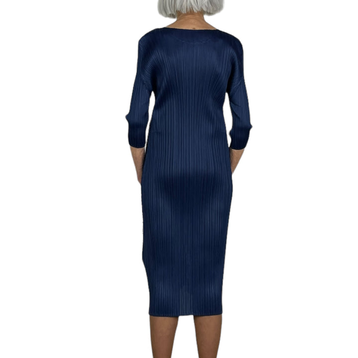 Pleated dress with a round neckline and 3/4 sleeves. Angular points at the knees for added volume.
