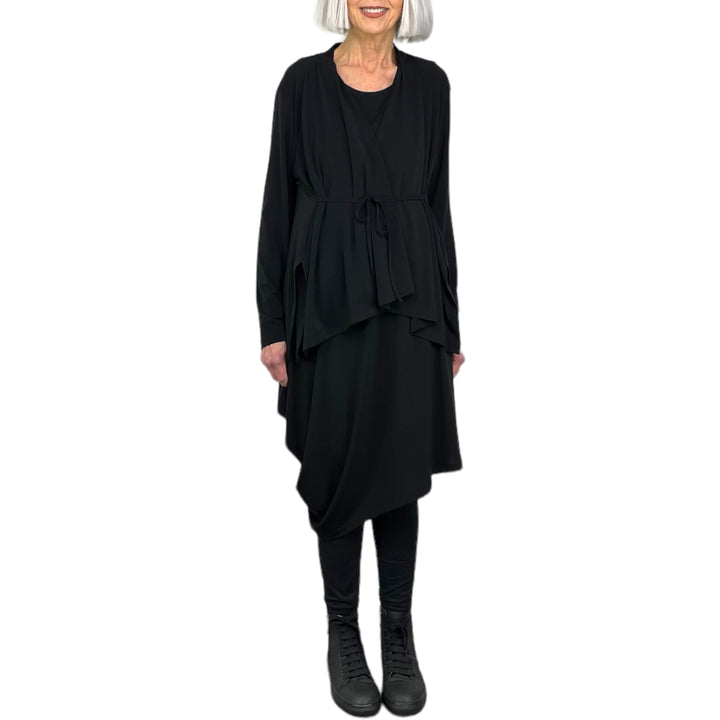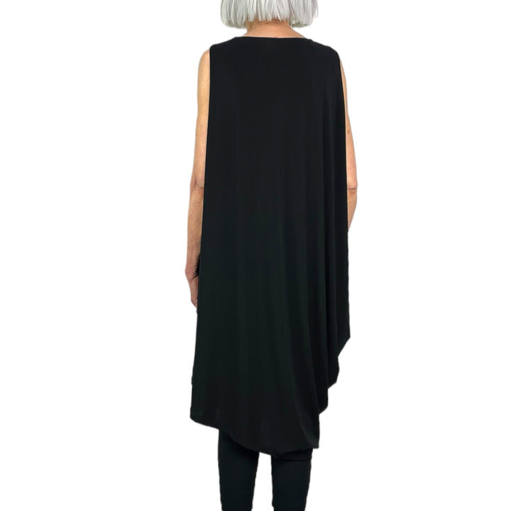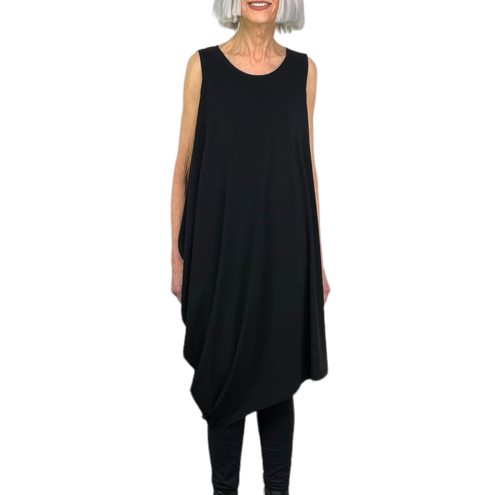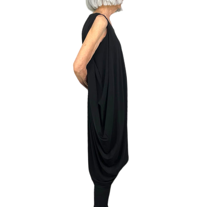 Sleeveless draped jersey dress with round neck and asymmetric hemline. Two side pockets.