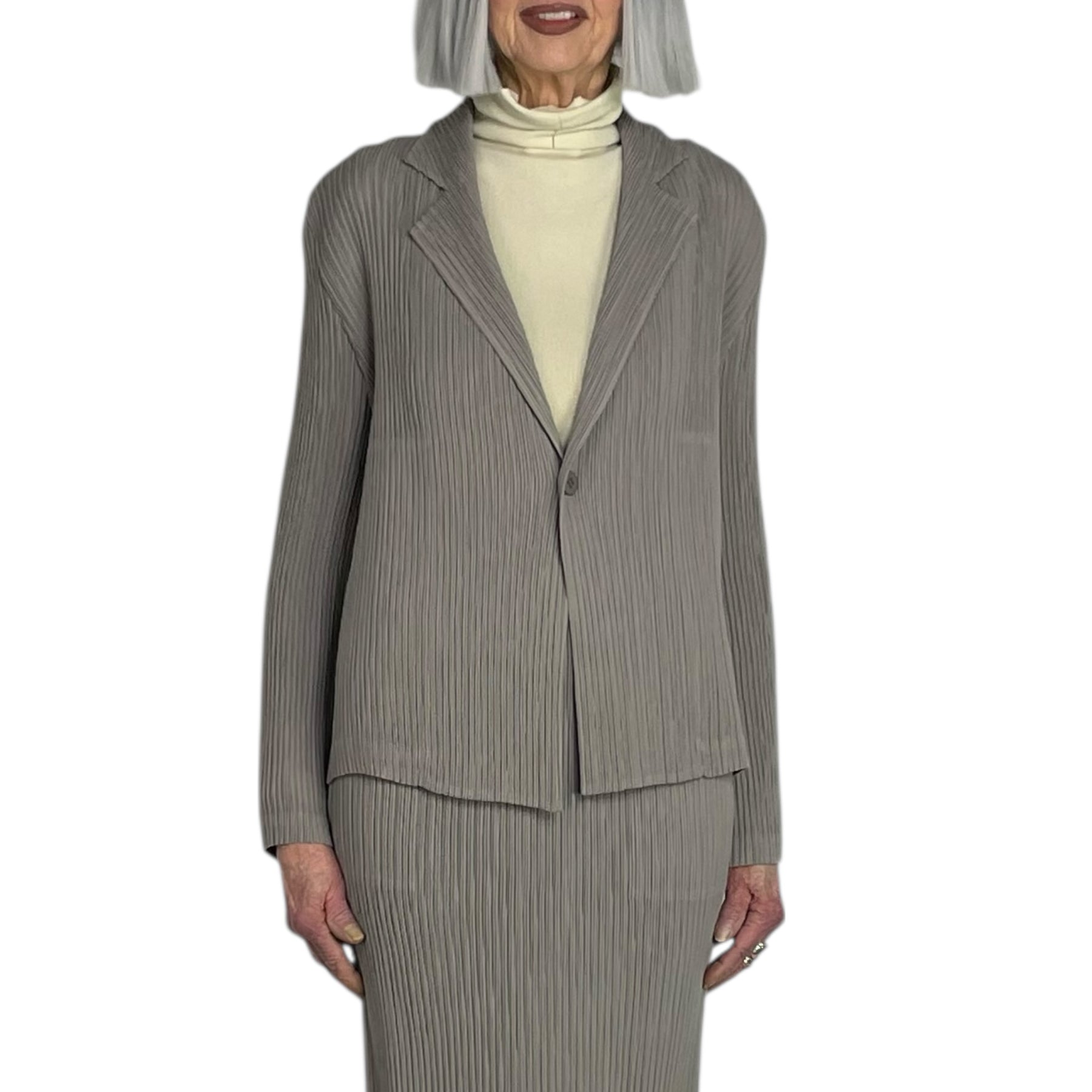 Long sleeve single button front jacket with a notched collar and two side pockets.